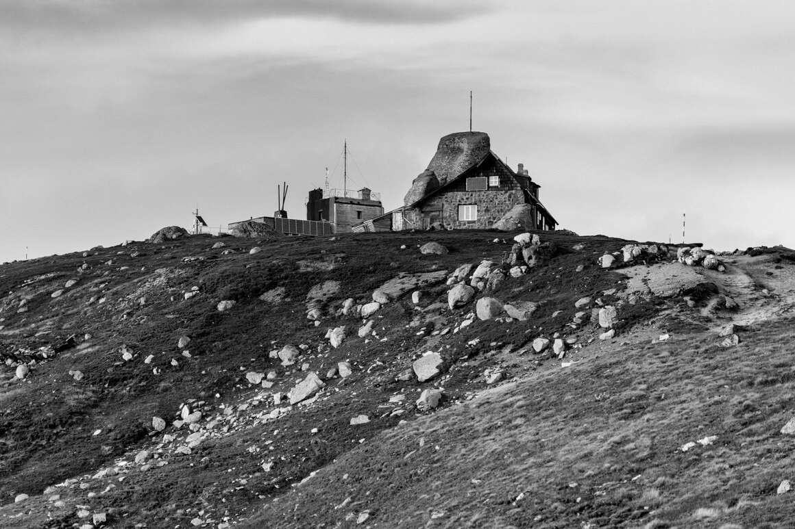 Abia mai trăgeam de mine când am ajuns la Cabana Omu, o construcție lipită de stâncă, celebrul bolovan lângă care se pozează turiștii și unde mai vin oameni să mediteze sau să se încarce cu tot soiul de „energii”. Cabana a fost ridicată în 1926 pe locul unde, la sfârșit de secol 19, Asociația de sași SKV Brașov pusese temelia primei cabane de piatră din Bucegi. Undeva, în spatele ei, se profila pe cerul întunecat o clădire ciudată, ca o corabie. Stația Meteorologică Vârful Omu.