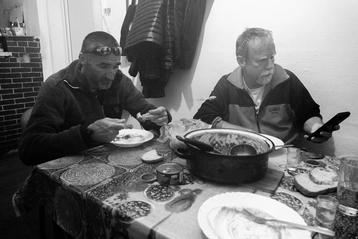 S-a înnorat și a început să sufle un vânt rece, așa că intrăm cu toții în bucătărie, unde ne încălzim cu o ciorbă de cartofi cu afumătură și tarhon făcută de Radu. Azi e ziua lui liberă și se simte stăpân pe bucătărie - pe lângă ciorbă, a făcut și mazăre cu carne și a copt pâine. Sergiu, care va lucra până în următoarea dimineață la 10.30, tocmai a dat meteorul și coboară și el la masă. Rodica, pisica alb-negru, a mâncat deja și doarme ca de obicei pe un scaun, lângă sobă.