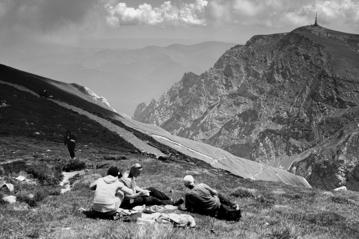 Între timp, în fața Cabanei Omu s-au adunat foarte mulți turiști. Unii stau tolăniți pe iarbă, mănâncă sandvișuri și beau bere Albacher, singura pe care o găsești la cabană, alții fac live-uri și se pozează la pietroi, înfășurați în tricolor.