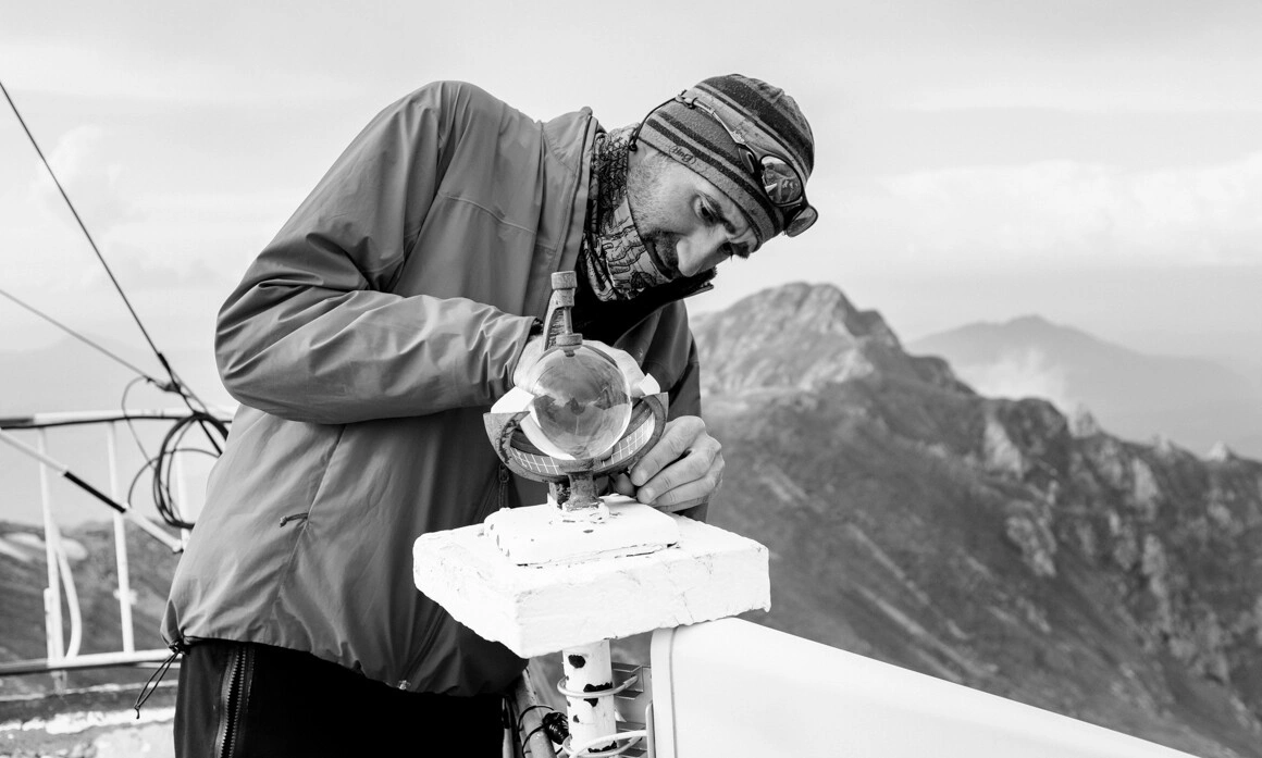 Deși sistemul de monitorizare hi-tech a vremii a ajuns în vârf de munte în 2016, meteorologii n-au renunțat la toate piesele vechi. Acum, că s-a potolit și ploaia, Radu mă ia pe terasă, unde se află un heliograf, cu care măsoară durata de strălucire a soarelui. Are ceva magic, atât prin forma lui - o bilă de cristal montată pe un suport metalic -, cât și prin felul în care e așezat pe terasă. O simplă bilă de cristal, în jurul căreia pare că se învârte totul: vârful Bucșoiu, aflat undeva în stânga, releul de pe Vârful Coștila, abia ieșit din ceață, norii Cumulus Humilis și Cumulus Mediocris, care se ridică domol dinspre Colții Morarului, și stolurile de mierle care se rotesc deasupra noastră.