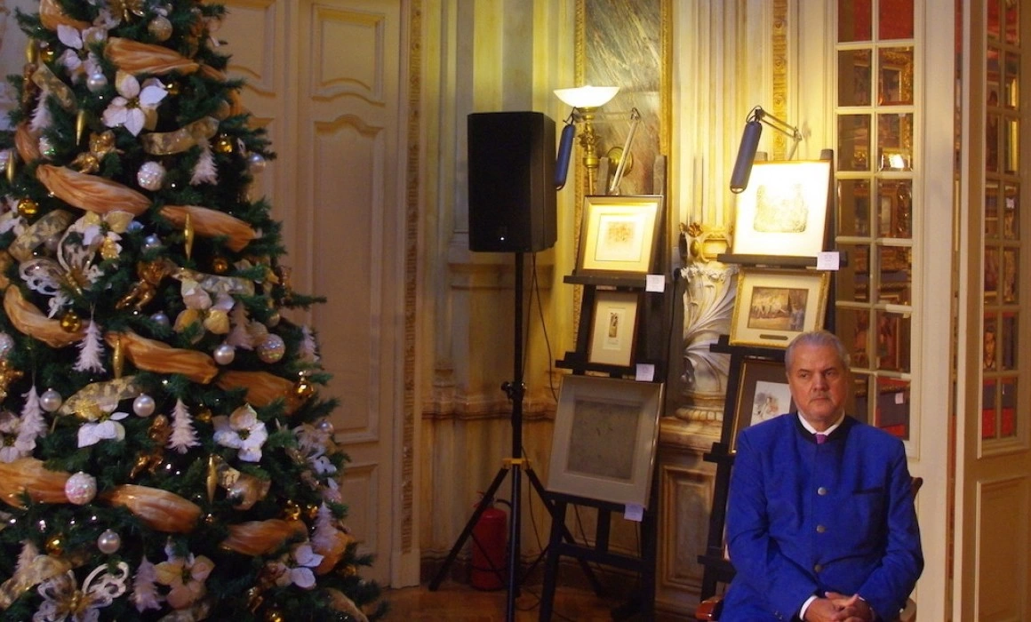 Lumina intră printr-un tavan de sticlă și coboară peste firide din care se desprind statui cu îngeri aproape goi, coloane, cupe, busturi, picturi murale. Asortat cu acest decor, în dreapta măsuței pregătite pentru profesorul Năstase e un brad împodobit cu îngeri, fluturi albi enormi și beteală aurie. Ca să mai treacă timpul, îl întreb pe Sângeorzan despre istoria palatului. Zice că, la început de secol al XX-lea, era unul dintre primele din București cu încălzire centralizată. Pe vremea lui Ceaușescu, la parter era un magazin cu circuit închis, de unde nomenclatura își cumpăra salam și alte cele. După Revoluție, interiorul a fost refăcut după niște imagini vechi, apoi s-a umplut de artă.