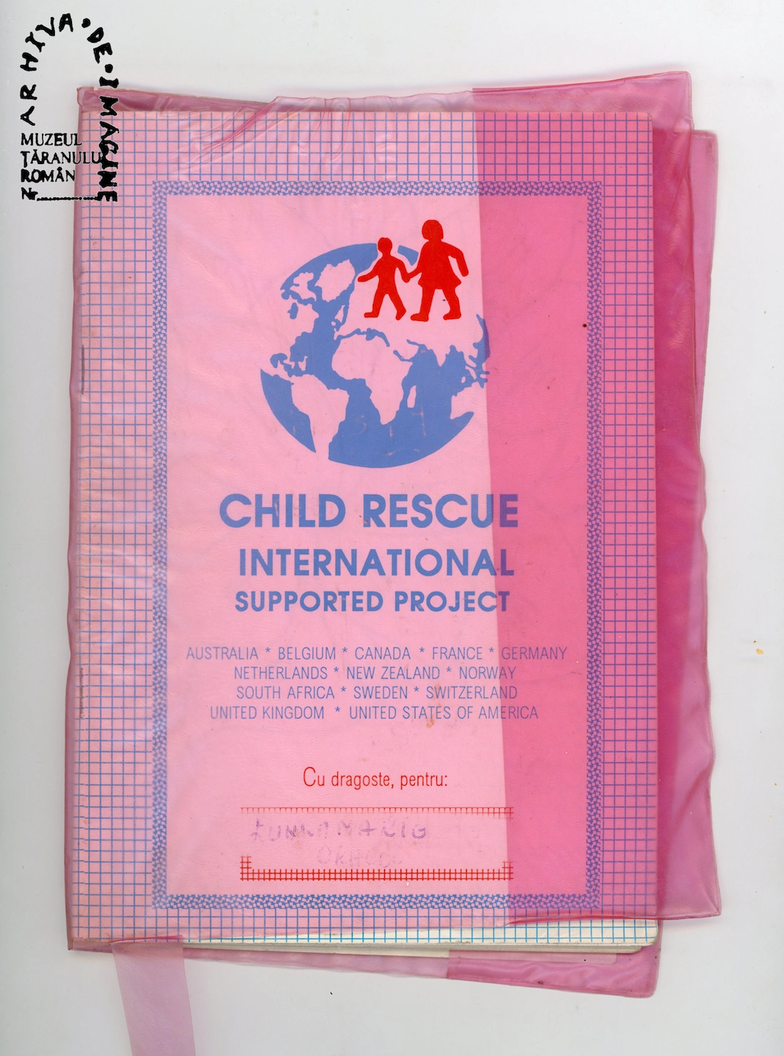 Ajungem la un caiet Herlitz, cu copertă strălucitoare. Mai sunt unele verzi, cu niște tineri în blugi, cu ochelari de soare. Altele poartă sigla unui ONG, Child Rescue International Supported Project, și o mențiune deasupra etichetei: „Cu dragoste, pentru:”. Sunt, mai mult ca sigur, caiete „de la ajutoare”.