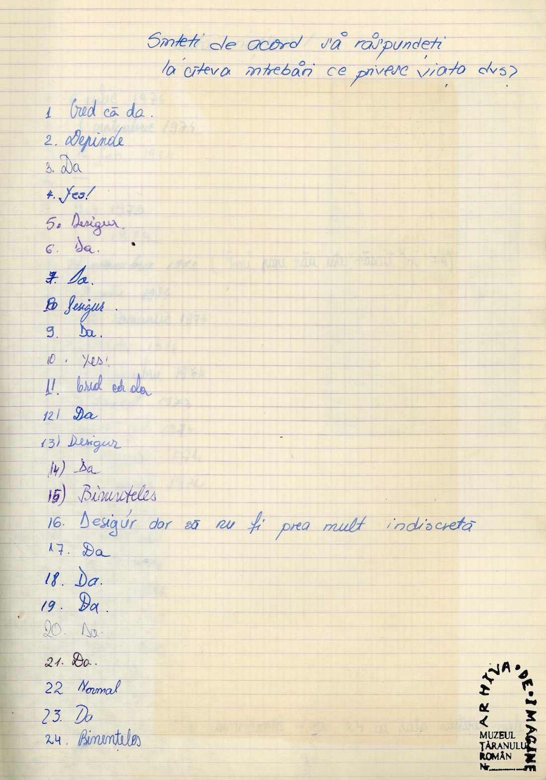 Și deceniile continuă să se învârtă în răspunsurile următoare, se vede în pagini cerneala războiului lângă cea a sfârșitului de comunism. Sunt răspunsuri de la puști de 19 ani și de la sexagenari, cuvinte naive și înțelepte, jucăușe și serioase, nimicuri care se cer iubite peste ani.