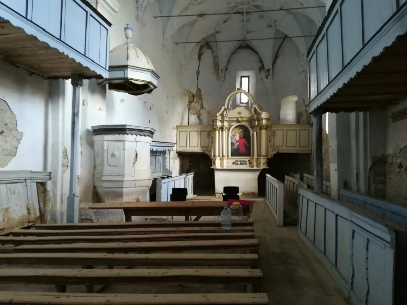 Înăuntru e răcoare și umezeală. Miroase a mucegai. Pereții sunt spoiți în culoarea cerului, iar pe jos, o dușumea veche, prăfuită. Băncile de rugăciune sunt la locul lor. „Lipsesc zece”, ne arată Alina găurile în care erau fixate. „Au dispărut înainte de a ajunge noi aici. Și bănuim că tocmai cei care aveau grijă de biserică le-au luat. Am făcut plângere la poliție și am cerut să fie anchetat cazul ca furt de patrimoniu. Poliția a început cercetarea ca pentru un furt de lemn și bineînțeles că nu s-a rezolvat nimic.”
