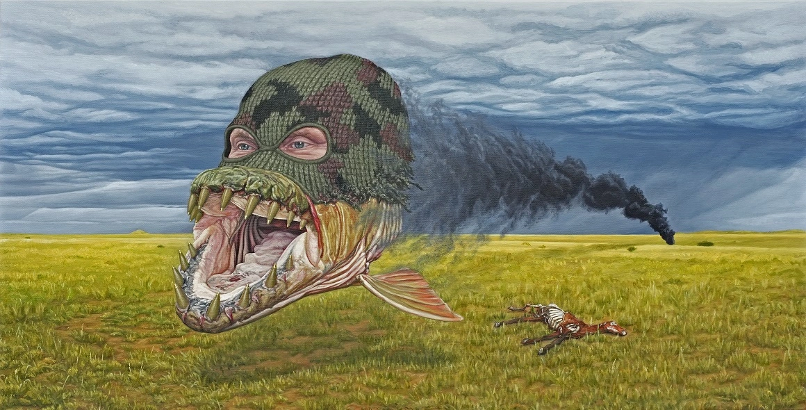 Adrian Preda, un pictor bucureștean născut în 1985, a rămas cu această curiozitate și după anii copilăriei. A ajuns de la desene naive cu caracatițe, șerpi sau maimuțe cățărate în palmieri, la reprezentări realiste ale unor animale, plasate în contexte care critică supremația umană în regatul natural și manifestările ei distructive. Îl interesează vietățile sălbatice și mai ales cele vulnerabile, pentru că vorbesc cel mai mult despre acțiunile iresponsabile ale omului-rege. Elefanți, zebre, antilope, bizoni, pisici sălbatice, delfini, balene, urși panda, urși polari, foci, pinguini.