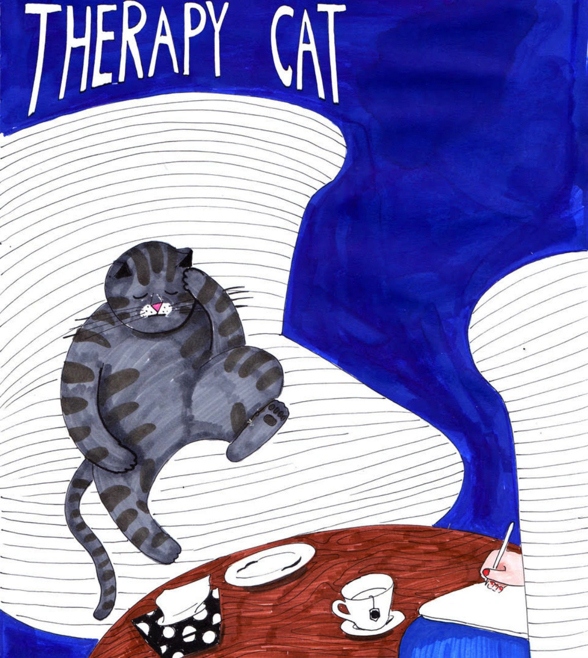Ideea de a crea o bandă desenată despre o pisică în terapie mi-a venit acum vreo doi ani, când am devenit colegă de apartament cu Steluța. Cred că i-am și zis in treacat Luizei (Vasiliu), într-o seară, în timp ce îi povesteam despre Home Alone. Și am lăsat ideea asta să stea așa, foarte cuminte, undeva într-un colt al minții, până când i-a venit rândul (adică mi-a venit mie să mă apuc să scriu niște replici pe un carnet). E gândită în română și scrisă în engleză, pentru că mie îmi place romengleza și nu mi-e rușine cu asta :) E încă (puțin) în lucru, dar are deja o copertă și un titlu - Therapy Cat (mi-asum sensul dublu, pentru că pisica ce mi-e model și muză pentru carte - Steluța - contribuie foarte mult la liniștea și sănătatea mea mintală, deci e și o therapy cat pentru mine).