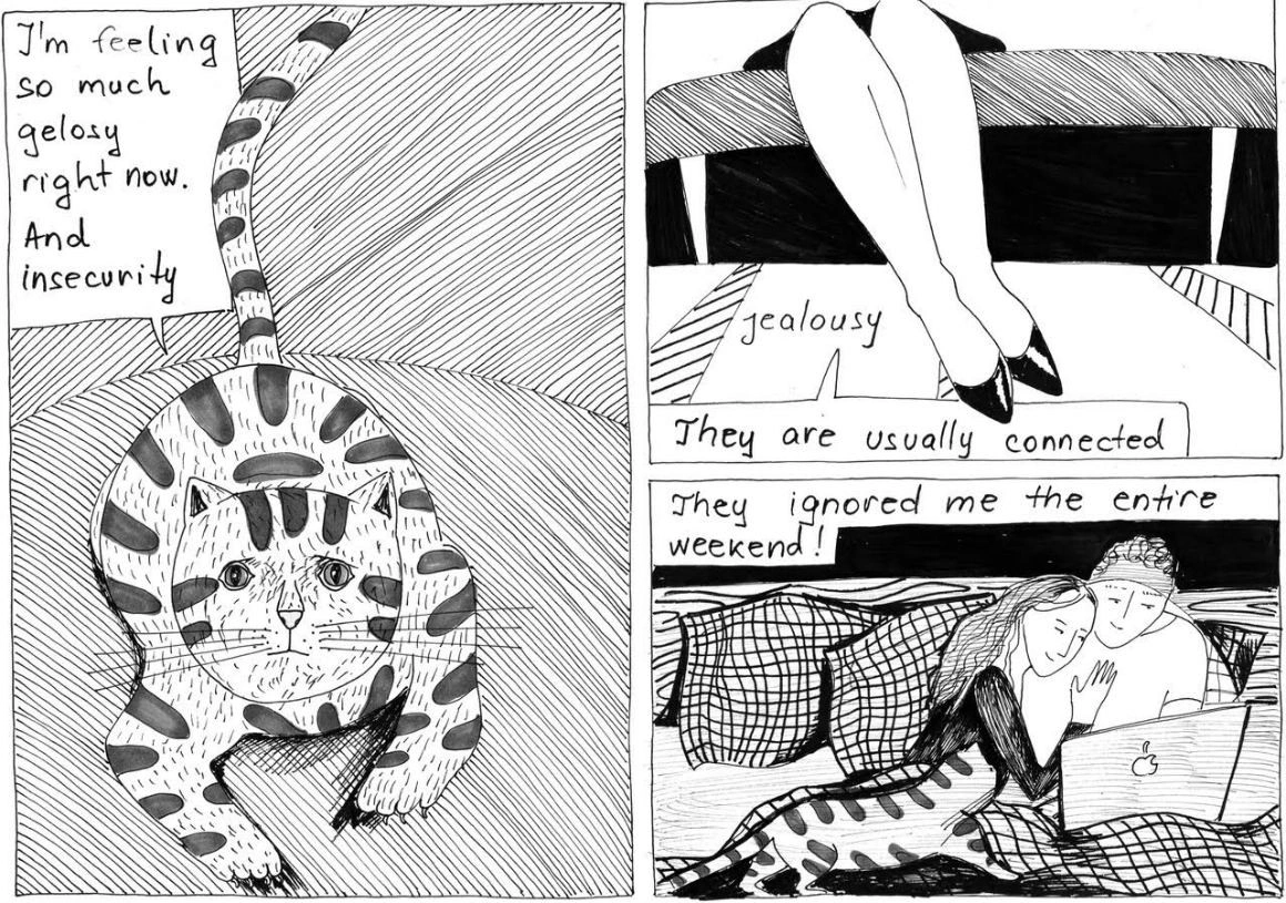 Toate dialogurile pe care le-am scris și desenat sunt jumătate despre încercarea mea de a înțelege acest mic animal misterios, fricos și curajos în același timp, anxios și plin de tabieturi, grațios și caraghios, față de care uneori am sentimente de vinovăție (oare o privez de libertate în acest apartament mic, oare mă urăște și mă privește ca pe un extraterestru care a răpit-o și o supune la experimente?), iar alteori am niște accese de tandrețe aproape sufocantă și de duioșie, care mă iau și pe mine prin surprindere. Și mai sunt și despre mine și propriile mele anxietăți, emoții, gânduri, pe care le-am exprimat in forma asta de semi-fabulă.
