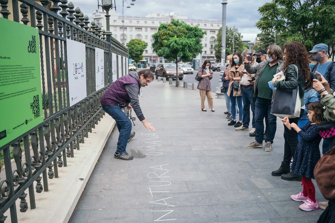 • Suntem cu toții în flăcări: Happening-ul lui Dan Perjovschi din deschiderea Platformei și a expoziției proprii de pe gardul Muzeului Național de Artă al României. Perjovschi a scris pe trotuar „natura umană” și apoi a tăiat cuvântul „umană”. Fără factorul „uman”, natura supraviețuiește. E o redare inconfortabilă a realității: omul e un animal toxic, inclusiv pentru propria specie.