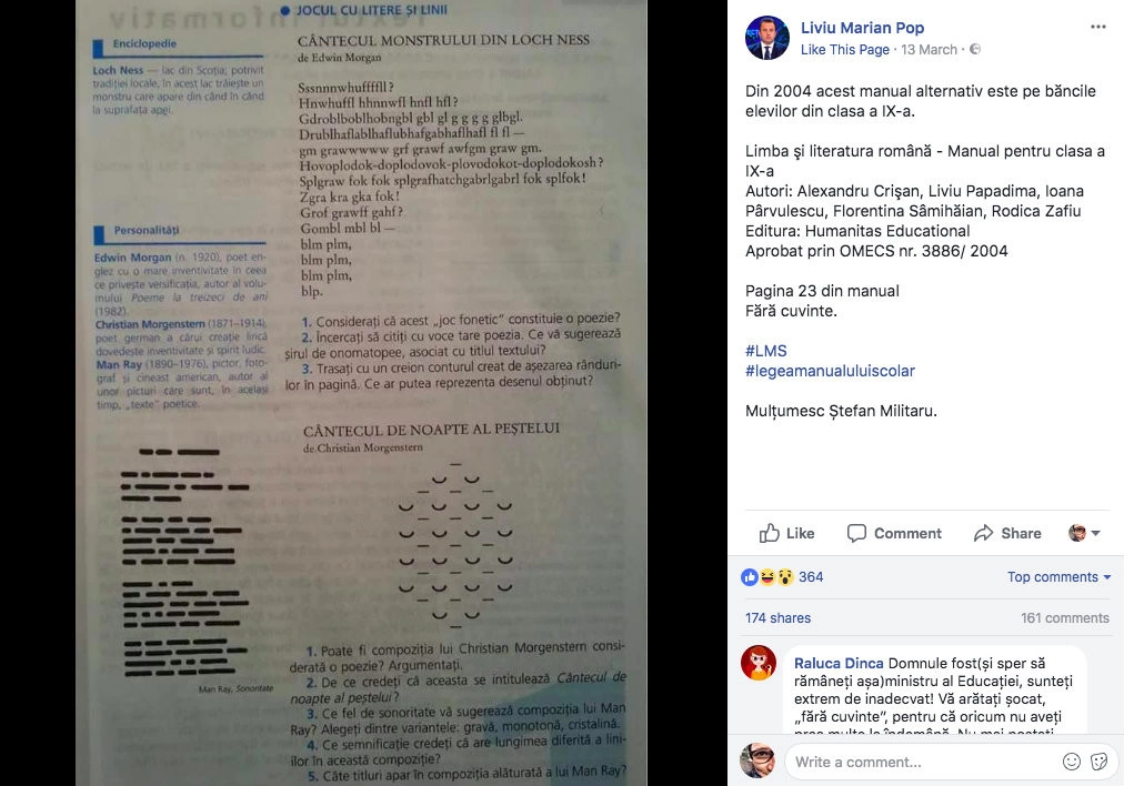 Liviu Pop, fost ministru al Educației, a descoperit poezia concretă într-un manual alternativ de-a noua și s-a declarat „fără cuvinte”. A distribuit pe pagina lui oficială de Facebook o poză din manualul înfierat și a adăugat haștagurile #LMS și #legeamanualuluiscolar. Liviu Pop este inițiatorul unei legi care urmează să interzică manualele alternative și să introducă în loc manuale unice pentru toate materiile. Toate vor fi tipărite de Editura Didactică și Pedagogică.