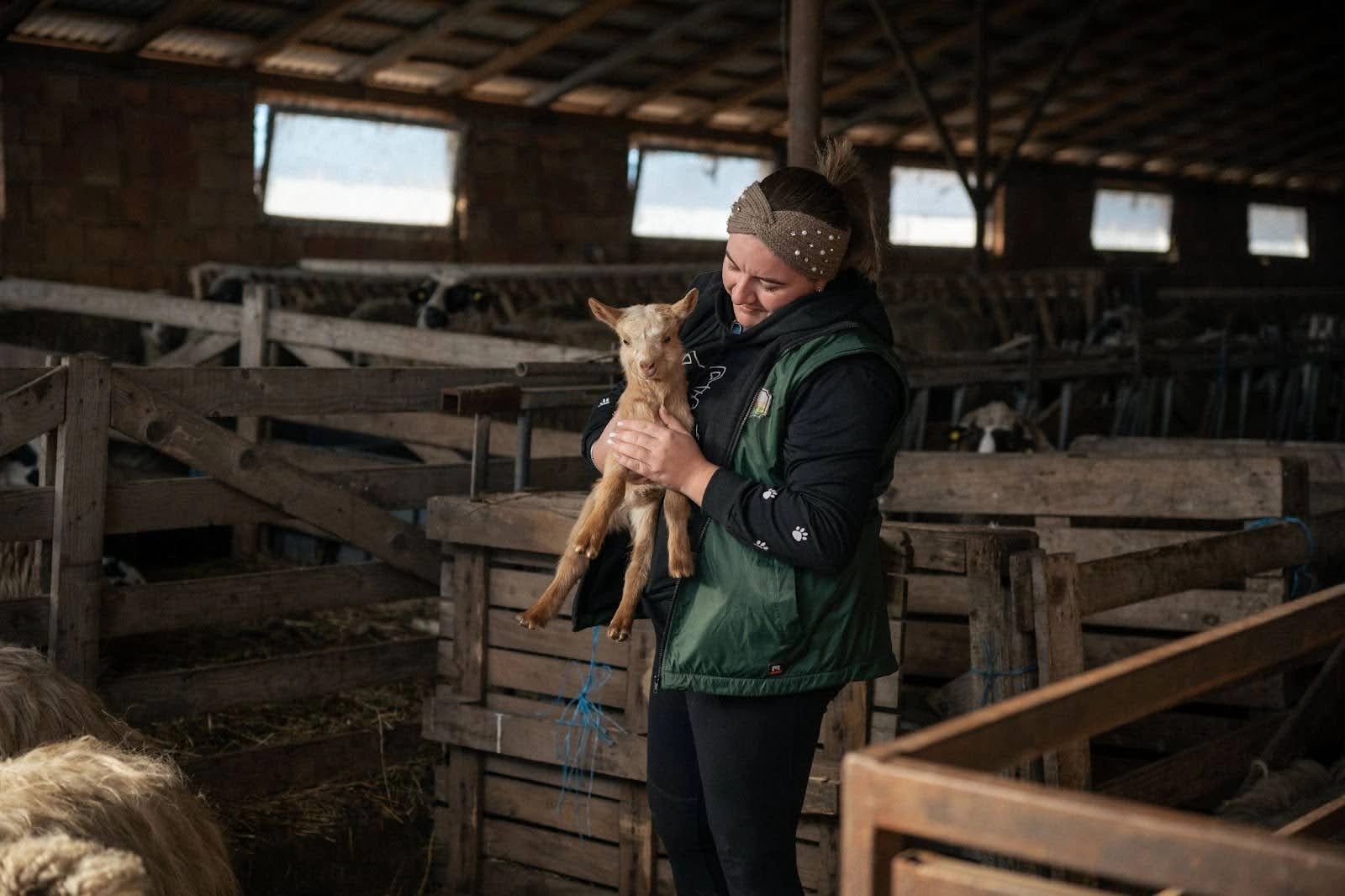 Privirea i se oprește asupra unei oi care stă separat de restul, în colțul opus al țarcului. „Oaia aia o să fete imediat, în câteva minute”, îmi spune. Văzându-mi confuzia, Oana îmi explică că se vede din poziția în care stă. Se apropie de ea încet, iar turma, și cei doi măgari, se strâng în liniște în jurul scenei, privind. În timp ce Oana ajută oaia să fete cu o relaxare și hotărâre care mă iau prin surprindere, privesc și eu, ținându-mi respirația în timp ce fotografiez, de teamă că aș sparge liniștea profundă.