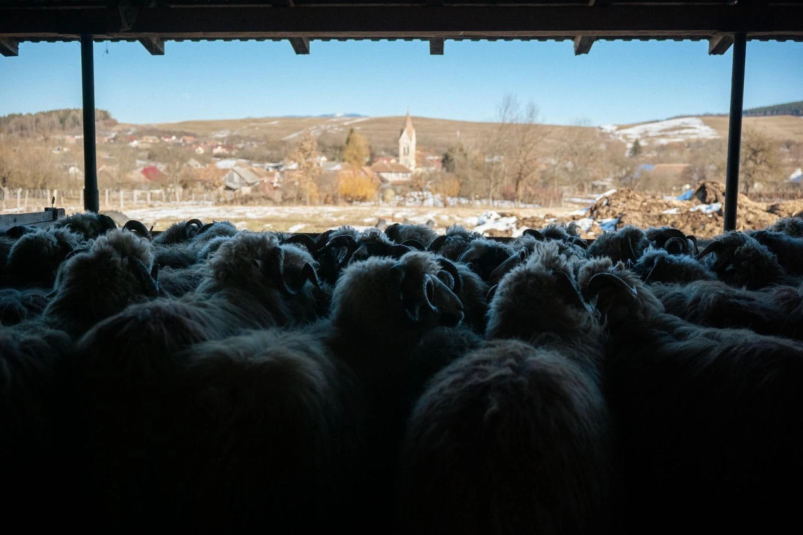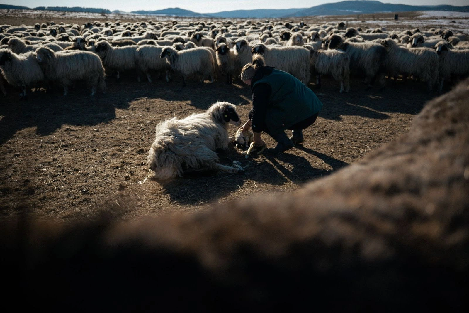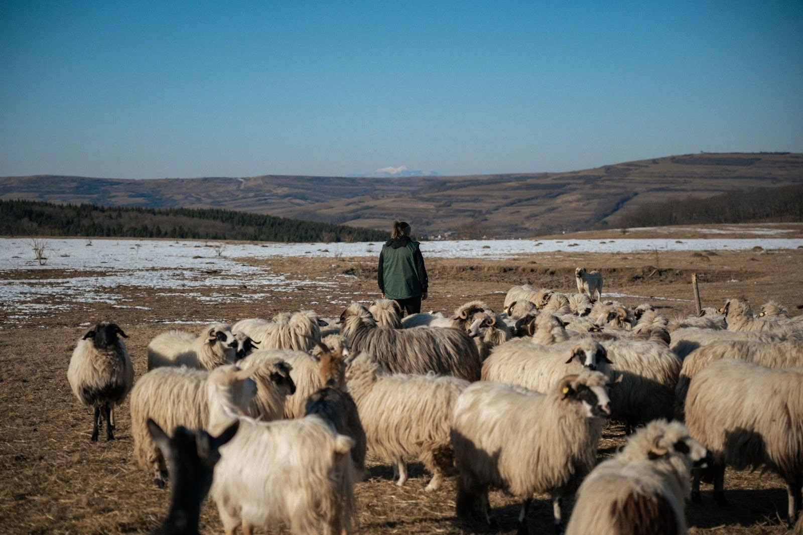 După ce Oana trece pe la toate țarcurile de la fermă, ca să inspecteze oile și mieii, ne urcăm în mașină ca să mergem la oile rămase pe pășunea comunală. E foarte aproape de sat, așa că ajungem repede, după un scurt drum pe dealul acoperit de zăpadă. Imediat ce coboară din mașină, Oana e din nou întâmpinată de de câinii stânei, care o salută lătrând și îi urmează ordinele. Odată intrată în țarcul făcut din gard electric, ea scrutează turma și caută să vadă dacă a fătat vreo oaie, cât timp au fost singure.