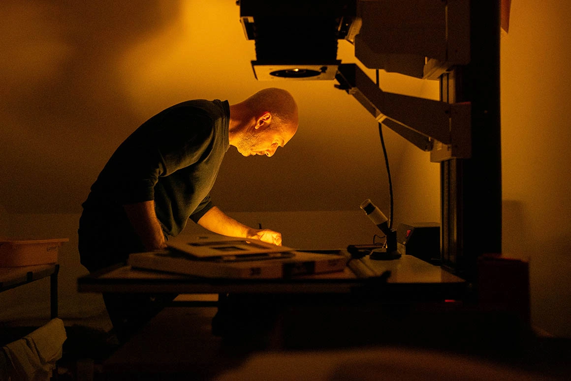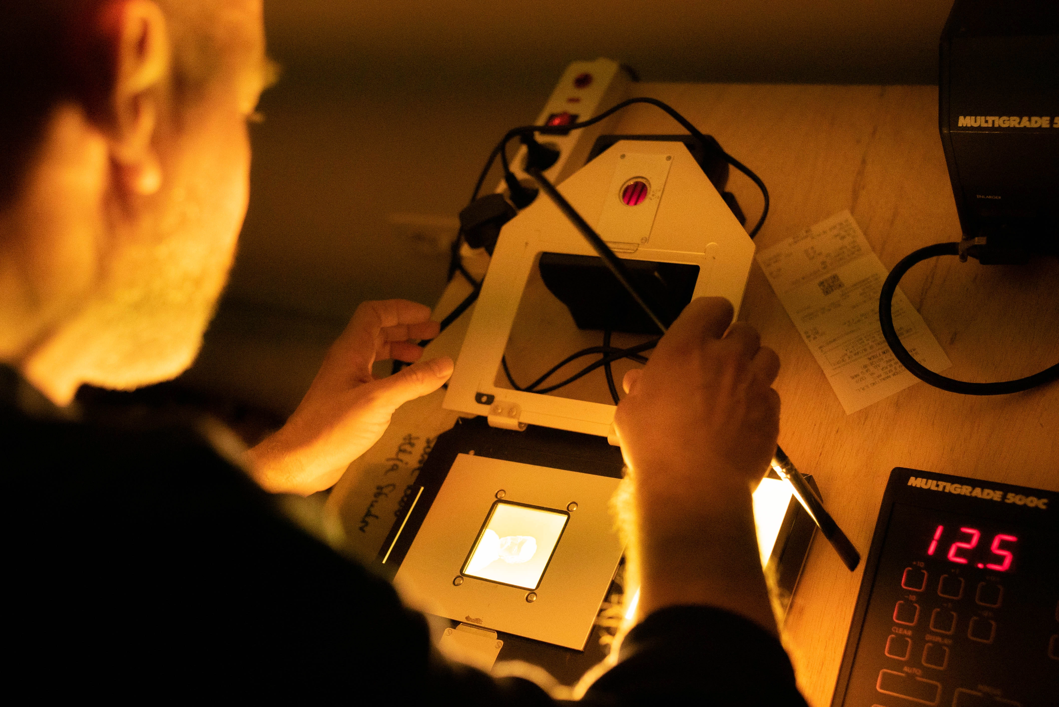 Când intru în laborator, Răzvan Anton, artist vizual și membru co-fondator al Arhivei Minerva, se pregătește să imprime portretele folosind negativele originale. În mod paradoxal, deși este cel mai simplu mod de a ajunge la imagine atunci când ai un negativ la îndemână, procesul necesită multă atenție și răbdare. Durează în jur de 4 ore pentru a imprima aproximativ 7 fotografii. „Dacă continui să faci mai mult, riști să faci greșeli pentru că obosești”, îmi spune Răzvan.