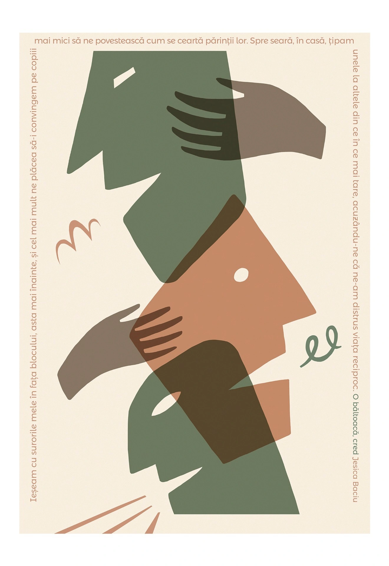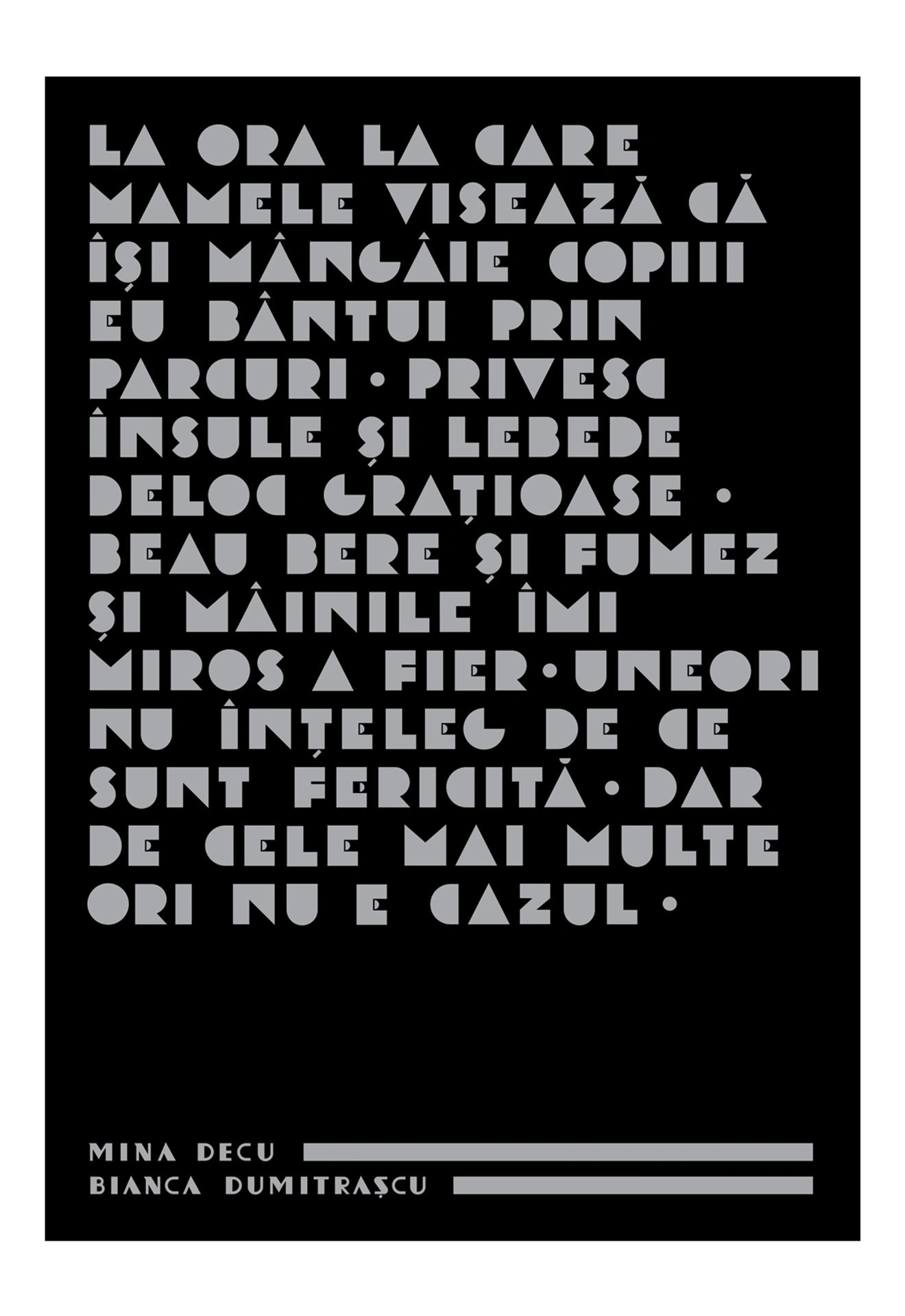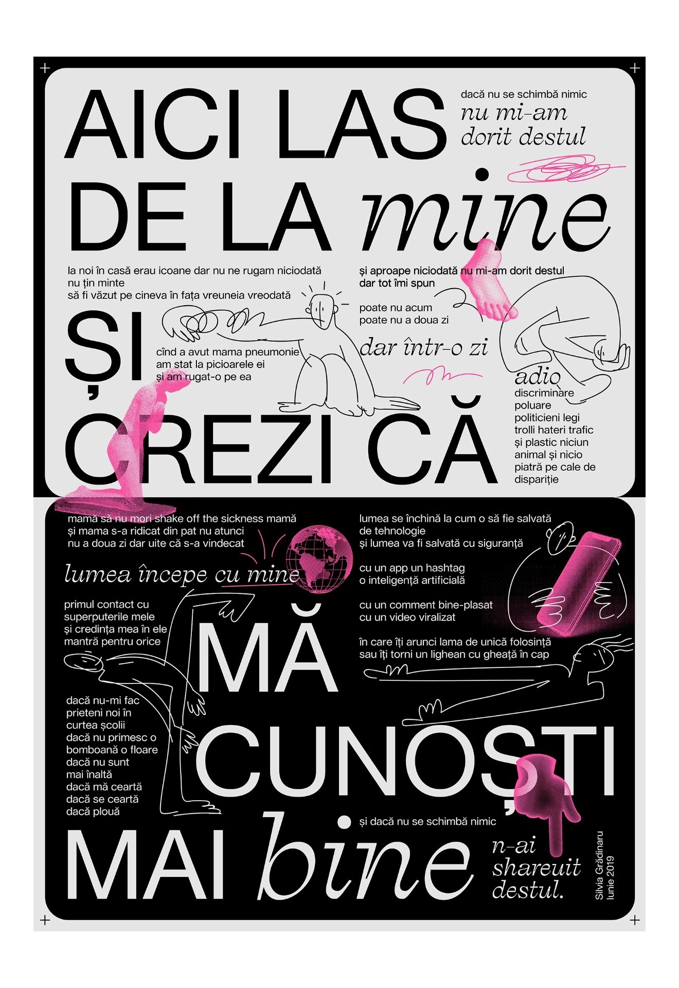Cu toate aceste lucrări ar fi urmat să se întâlnească direct, pe stradă, toți cei care-ar fi trecut primăvara asta prin fața Muzeului Național de Artă din București, unde au fost expuse. Doar că, odată cu restricțiile impuse de carantină și cu ieșirea plimbărilor din repertoriul obiceiurilor noastre până nu demult banale, nu prea mai are cine să le vadă. Ne-am gândit că, dacă tot #stămîncasă, ne-ar prinde bine să fim flâneuri măcar cu mintea & clicul. Așa că publicăm patru dintre lucrările colaborative din seria inițiată de studio GLITCH, cu invitația de a-i descoperi pe toți poeții, designerii, ilustratorii și typographer-ii în galeria digitală sau pe Instagram.