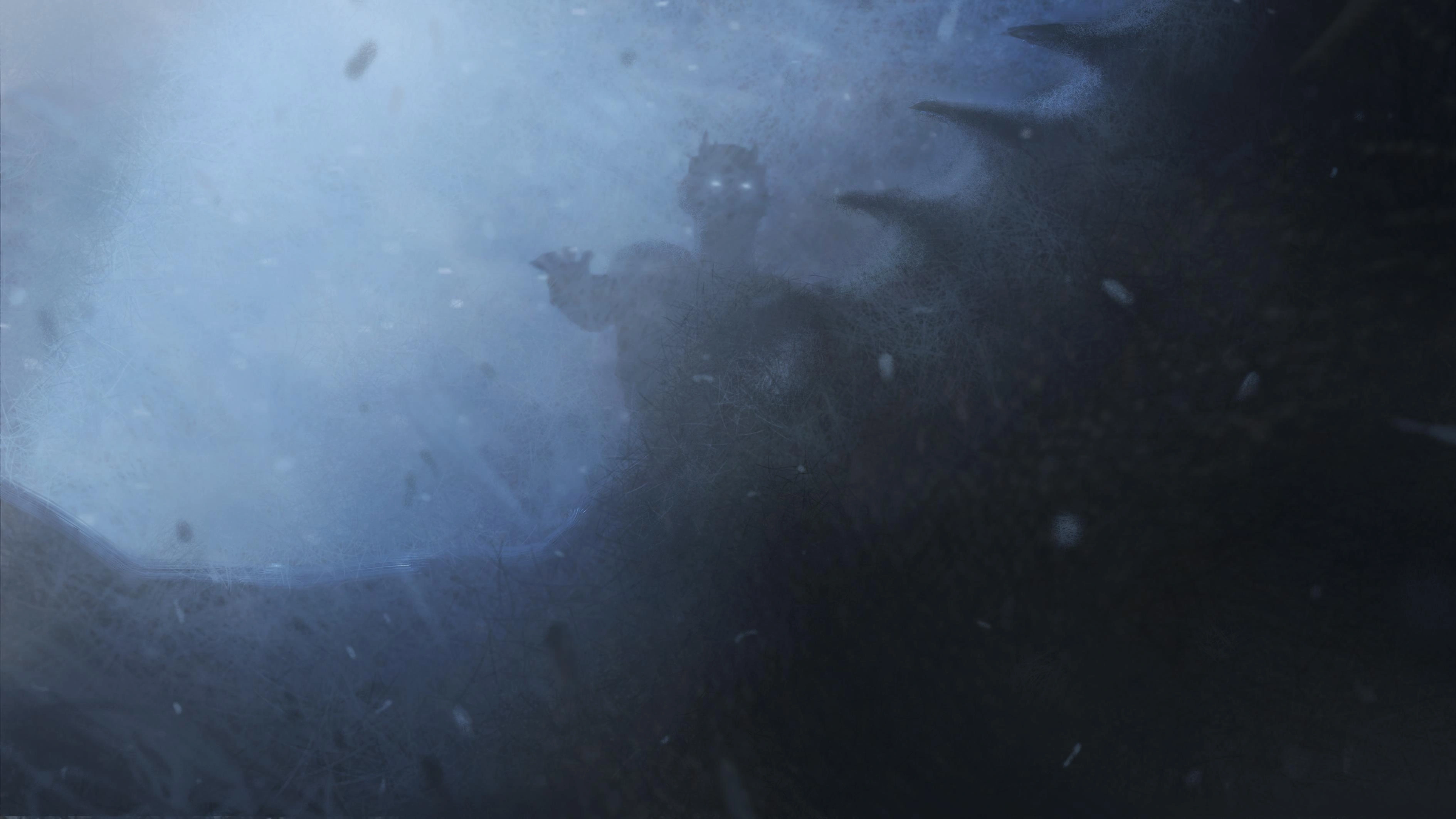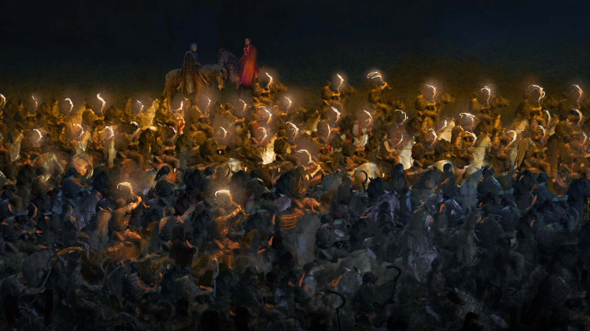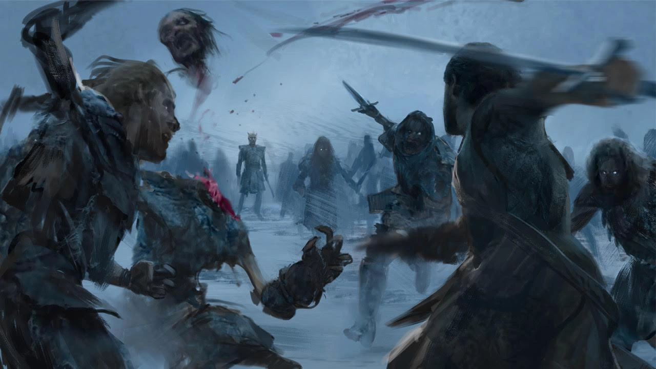 Uite, așa arată o ilustrație-cheie pentru Game of Thrones (vezi mai sus). Am primit înainte un excerpt din scenariu care zicea: The Night King trebuie să fie la o distanță de aproximativ 10 metri de cameră. El e personajul în jurul căruia se învârte acțiunea. În prim-plan îl avem pe protagonist, care își face loc prin armata de zombii către Night King. Am făcut schița asta pe baza descrierii respective. O schiță alb-negru, ca să meargă mai repede. Dar toate cerințele erau deja rezolvate în această ilustrație. Se aproba, iar următorul pas erau accentele de culoare și dinamica. Apoi mergea în post-producție și vedeai cum apare în film. Cei din post-producție aveau toată informația la îndemână. O compoziție de pictură digitală pentru Game of Thrones se traducea în poziția camerei de filmat. Tot ce făceai în acea ilustrație era respectat și se folosea în film. Mi-a plăcut mult asta.