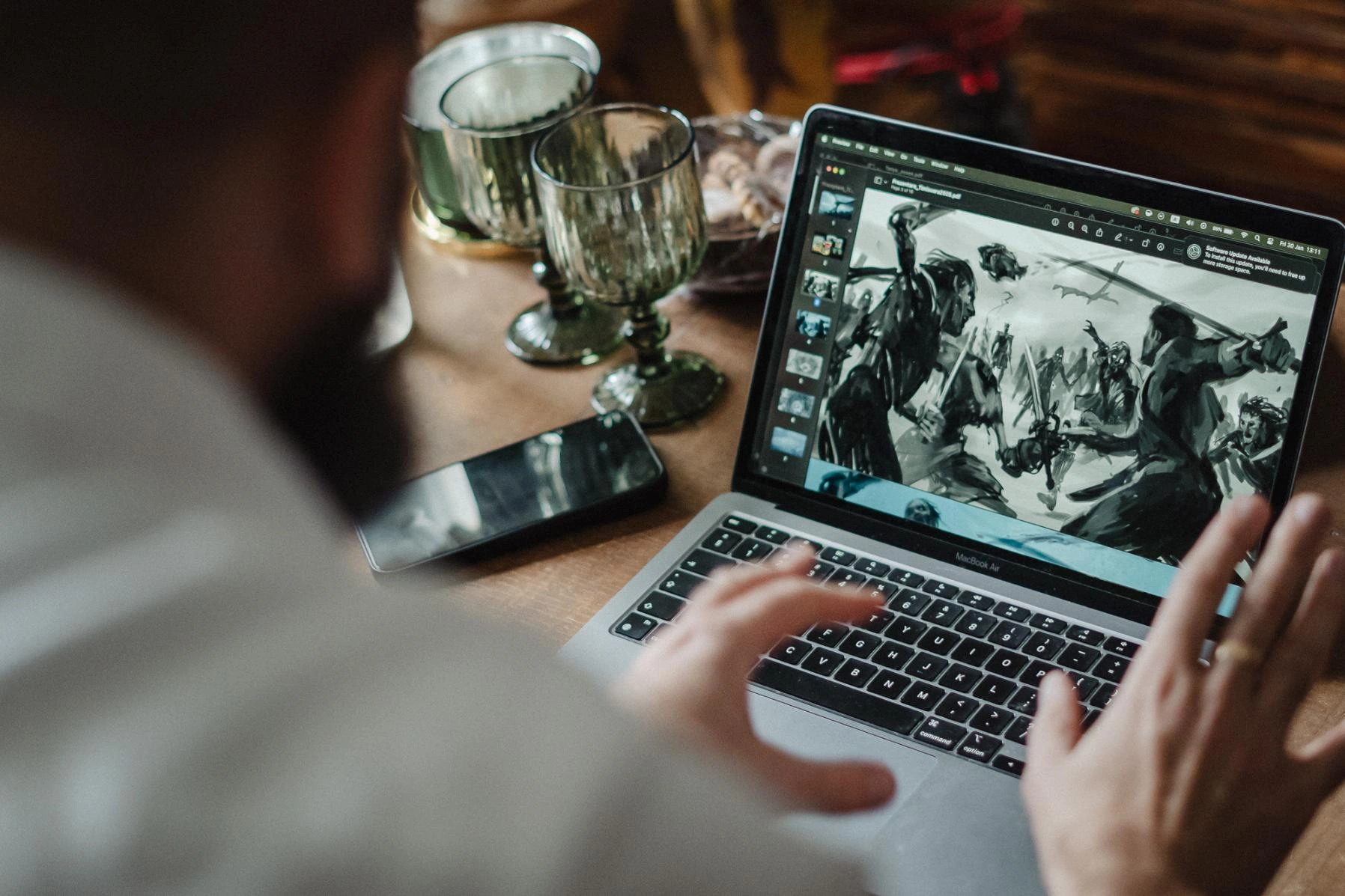 În apartamentul său din centrul Sibiului, Robert Șimon se urcă pe o placă de echilibru, în fața computerului. Lucrează tot timpul în picioare, ca să-și protejeze spatele. Deschide Photoshopul și mânuiește un stilou digital cu o viteză uluitoare. În mai puțin de șapte minute, improvizează din tușe scurte o scenă complexă. „O armată de oameni care se apropie de un sat”, spune el. „Compoziții de genul ăsta făceam și pentru Game of Thrones.”