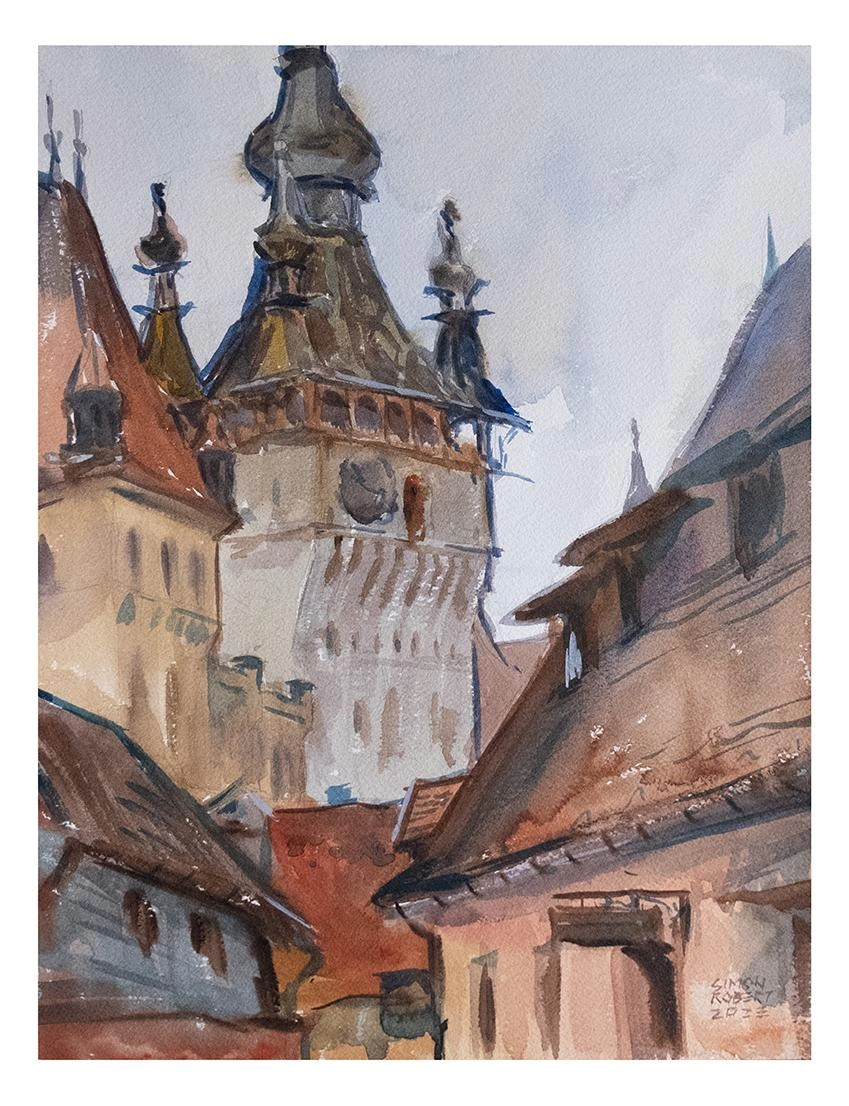 Robert face ilustrație digitală de 20 de ani, iar în paralel pictează în ulei și acuarelă, adesea în plein air. Are 43 de ani și s-a născut în Reghin. A fost concept artist la ultimele cinci din cele opt sezoane Game of Thrones, serialul fantasy care a doborât recorduri de audiență și a adunat 59 de premii Emmy. Unul dintre ele i-a revenit artistului din Sibiu, pentru efecte vizuale. Când l-am vizitat, statueta se întrezărea discret de după o draperie portocalie. Robert Șimon e modest când vine vorba de munca lui, în contrast cu apartamentul său elegant, unde și-a amenajat și atelierul. Are o masă de lucru, cu tuburi de vopsele și pensule, în holul de la intrare. Tot acolo sunt computerul unde face artă digitală și o bibliotecă din care ies în evidență volume ca The Art of Star Wars, Alien: The Archive sau Mad Max: Fury Road.
