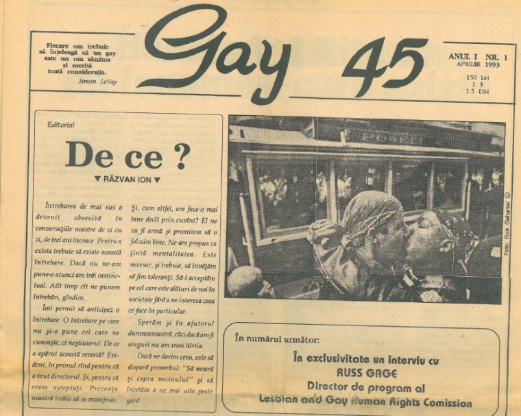 Scrisorile se termină prin ’95, când activistul şi-a încheiat voluntariatul la organizaţia din SUA. Între timp, în România, homosexualitatea începuse să-și arate fața în peisajul media. În aprilie 1993, apare Gay45, primul ziar gay din țară. Realizată de un colectiv restrâns, cu un tiraj de câteva mii de exemplare într-un peisaj în care ziarele mainstream aveau sute de mii, revista a fost refuzată iniţial de o tipografie şi distribuită manual prin București. A supraviețuit doar două numere și-a încercat să coaguleze un discurs gay identitar, având puternice accente politice. Vorbea acuzator despre situația gay-ilor încarcerați, comenta articolul 200 și fenomenul HIV sau traducea articole despre homosexualitate pentru publicul local.