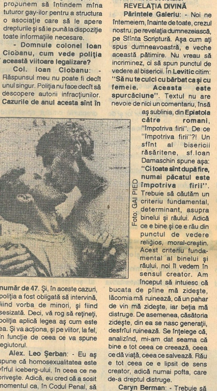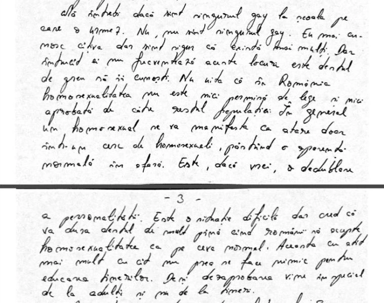 „M-am gândit să vă scriu în speranţa că îmi veţi putea trimite şi mie câteva reviste gay, pentru că aşa cum ştiţi, aici nu poate fi vorba de aşa ceva. Sincer să fiu, vă invidiez că sunteţi acolo şi eu sunt aici. Deci cum v-am spus, mă cheamă X, am 28 de ani, am 1,80, 75 de kilograme, ochi căprui şi părul şaten şi creţ. De altfel, v-am trimis şi o poză (nu este prea reuşită). De profesie sunt balerin (dansator liber-profesionist) şi dansez într-un night club din Bucureşti. Am fost plecat în două turnee, unul de zece luni în Iugoslavia, şi unul de şase luni în Cipru, dar ei (nici ei) nu au reviste gay pe acolo. Cât despre mine, ce să vă spun, sunt bisexual, îmi place să fac dragoste şi cu femei, şi cu bărbaţi, dar ca să fiu sincer, cu băieţii fac ceva mai rar pentru că îmi este frică de AIDS. Pasiunile mele sunt cititul, muzica, dansul, bineînţeles, îmi place să călătoresc, îmi plac pisicile, iubesc natura şi oamenii. V-aş rămâne îndatorat dacă aţi putea să-mi trimiteţi o revistă cu bisex (dacă se poate, porno)”.