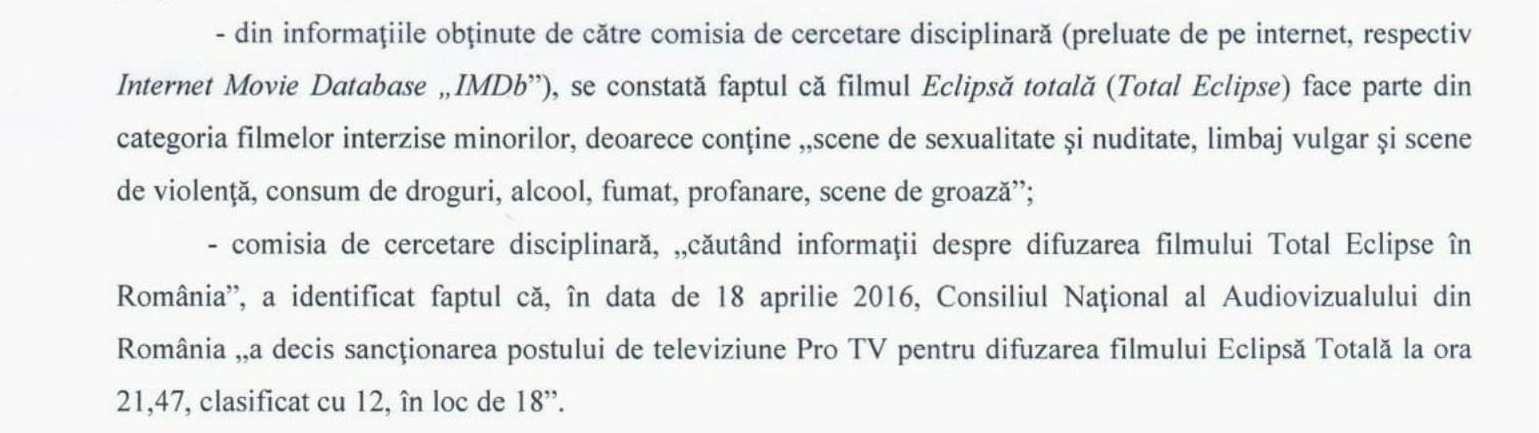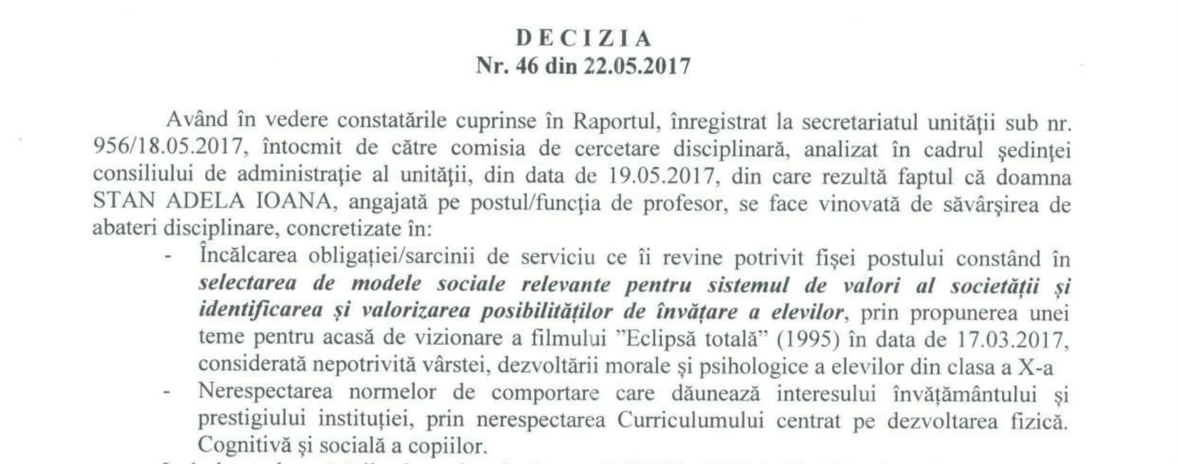 Comisia de disciplină înaintează concluziile anchetei către Consiliul de Administrație al Școlii. Consiliul decide sancționarea profesoarei cu „observație scrisă”: