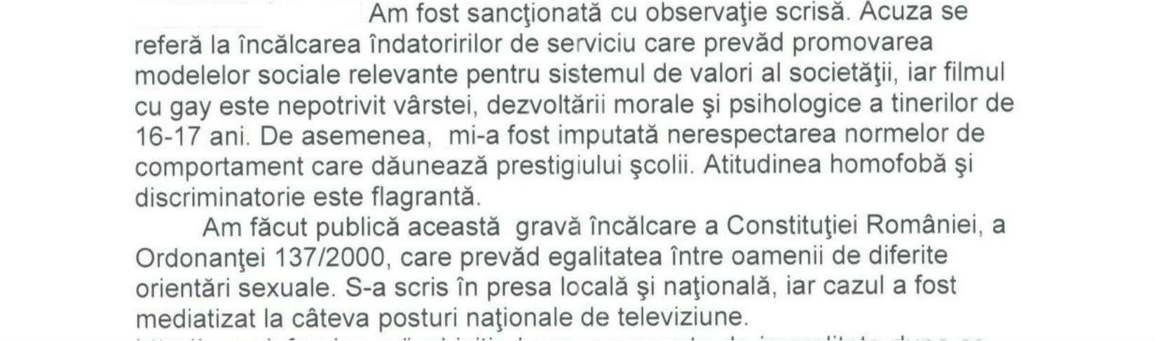 Știrea sancționării unei profesoare din cauză că le-a recomandat elevilor „un film cu gay” a ajuns rapid în presa locală și-apoi în cea națională. Directoarea Colegiului a declarat că n-a fost din cauză că era „cu gay”, ci pentru că „acest film, aşa cum apare şi pe arhiva CNA, a fost catalogat pe categoria 18+ şi considerăm că nu este potrivit şi adaptat vârstei”.