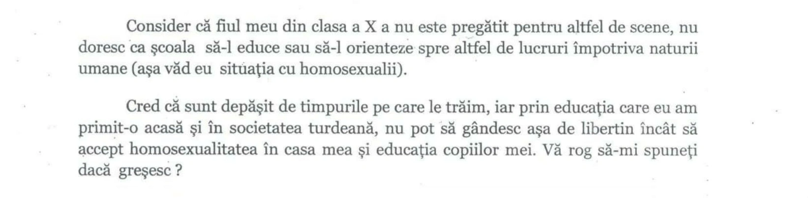 „Tema n-a fost obligatorie. De obicei ea ne mai dă filme să ne uităm dacă avem chef sau dacă vrem. Așa ni l-o recomandat și pe ăsta. Eu sunt de acord să vorbim despre relațiile homosexuale și nu voiam să se facă un scandal de la lucrul ăsta. Nu ne schimbăm deloc țara dacă continuăm așa.”
