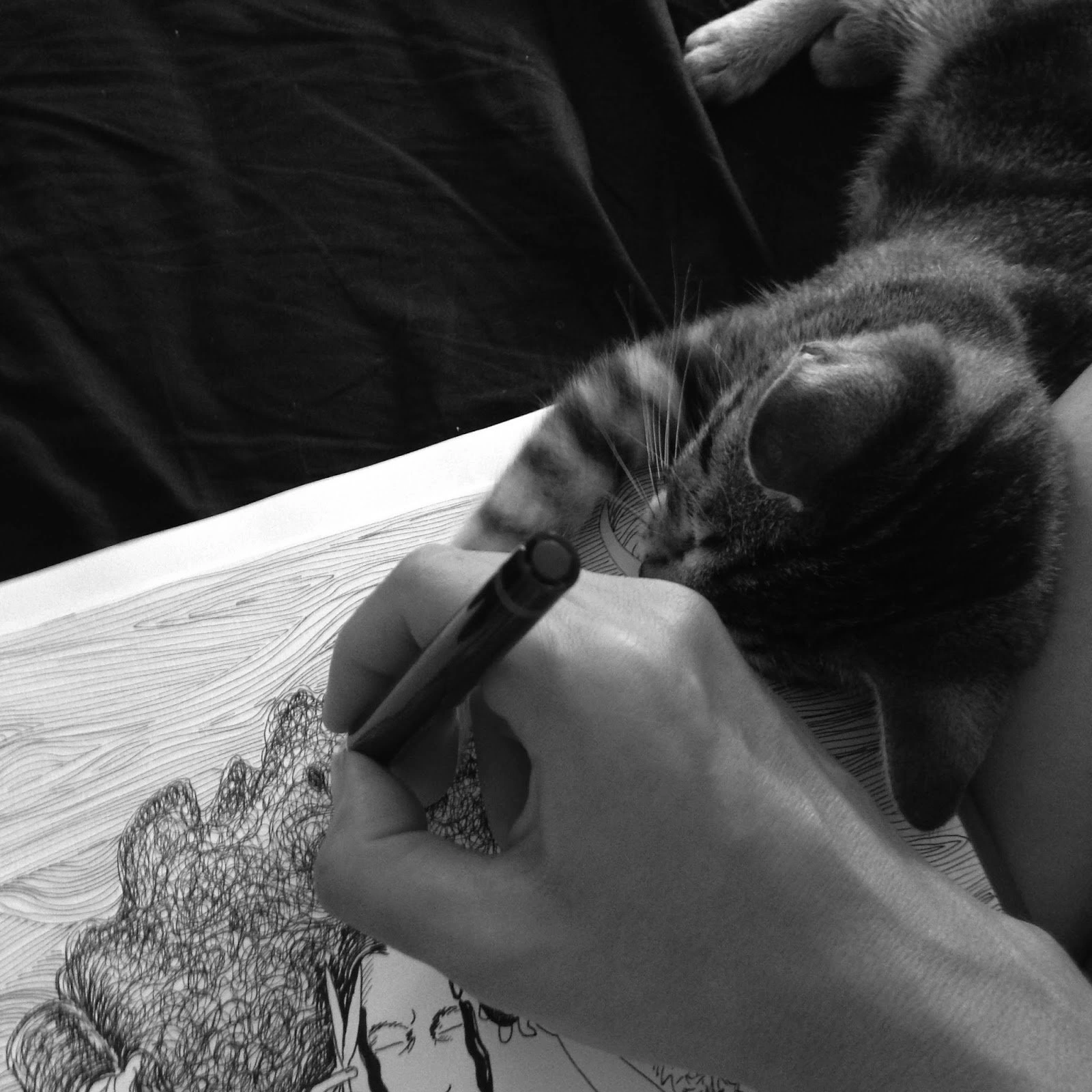 Desenează pe hârtie și dup-aia scanează. „Mai întâi cu creion și apoi cu linere, cu isograph. Iar spațiile mai mari le fac cu tuș, cu pensula.” Dintre ilustratoarele de la noi, îi place mult de Sorina Vazelina („îmi place la ea că face detalii multe, e maniacă”) și de Oana Lohan (pe care o admiră pentru că lucrează în zona realismului). Iar de-afară, o stalkuiește pe Amélie Fontaine, o ilustratoare din Franța, dar o enervează că postează rar. „Ar trebui să-i scriu că-mi place, nu?”