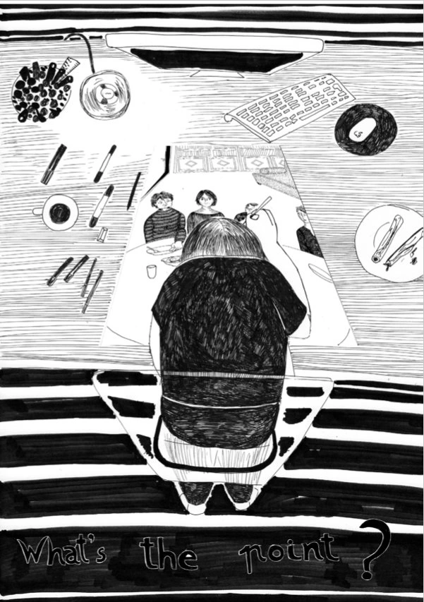 O invidiez pentru că e autodidactă. În ultimii 10 ani, a învățat singură să deseneze. A fost atentă la linii, la umbre, la chipuri, la gesturi. Are mereu un meta-discurs despre faptul că e cineva-care-desenează, în procesul de-a deveni un ilustrator full life. Își pune întrebări, încearcă variante, dar, cel mai important, nu se oprește din desenat. „Eu chiar cred că oricine poate să deseneze”, îmi spune din spatele unui pahar de roze. „Mi se pare că trebuie doar să-ți placă, să faci niște încercări. Și dacă-ți place mâzgălitul ăsta, ajungi în timp să-l faci cât de cât ok tehnic și să poți exprima niște lucruri.”