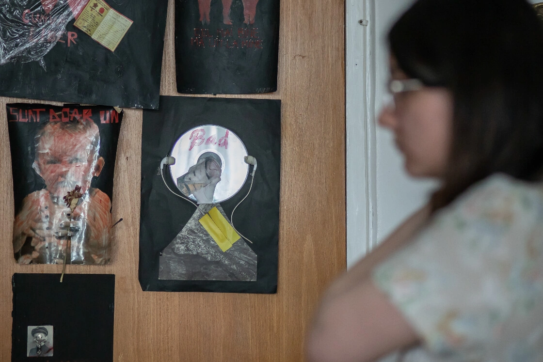Adolescența i-a adus prima despărțire din viața conștientă și prima depresie. S-a mutat cu bunicul la Târgoviște, iar prietena ei cea mai bună s-a mutat și ea în alt oraș. Atunci s-a simțit din nou singură. Devenise un roboțel care intra și ieșea pe poarta școlii. Din tristețea asta a apărut primul colaj, fără să știe că ceea ce a ieșit din gândurile și emoțiile ei poartă numele ăsta. Pe o planșă au apărut un CD, o pereche de căști tăiate și un chip gata să se scufunde într-un pahar. Prima lucrare a rămas și ea multă vreme singură. Depresia avea să-i devină motor de creativitate abia cinci ani mai târziu.