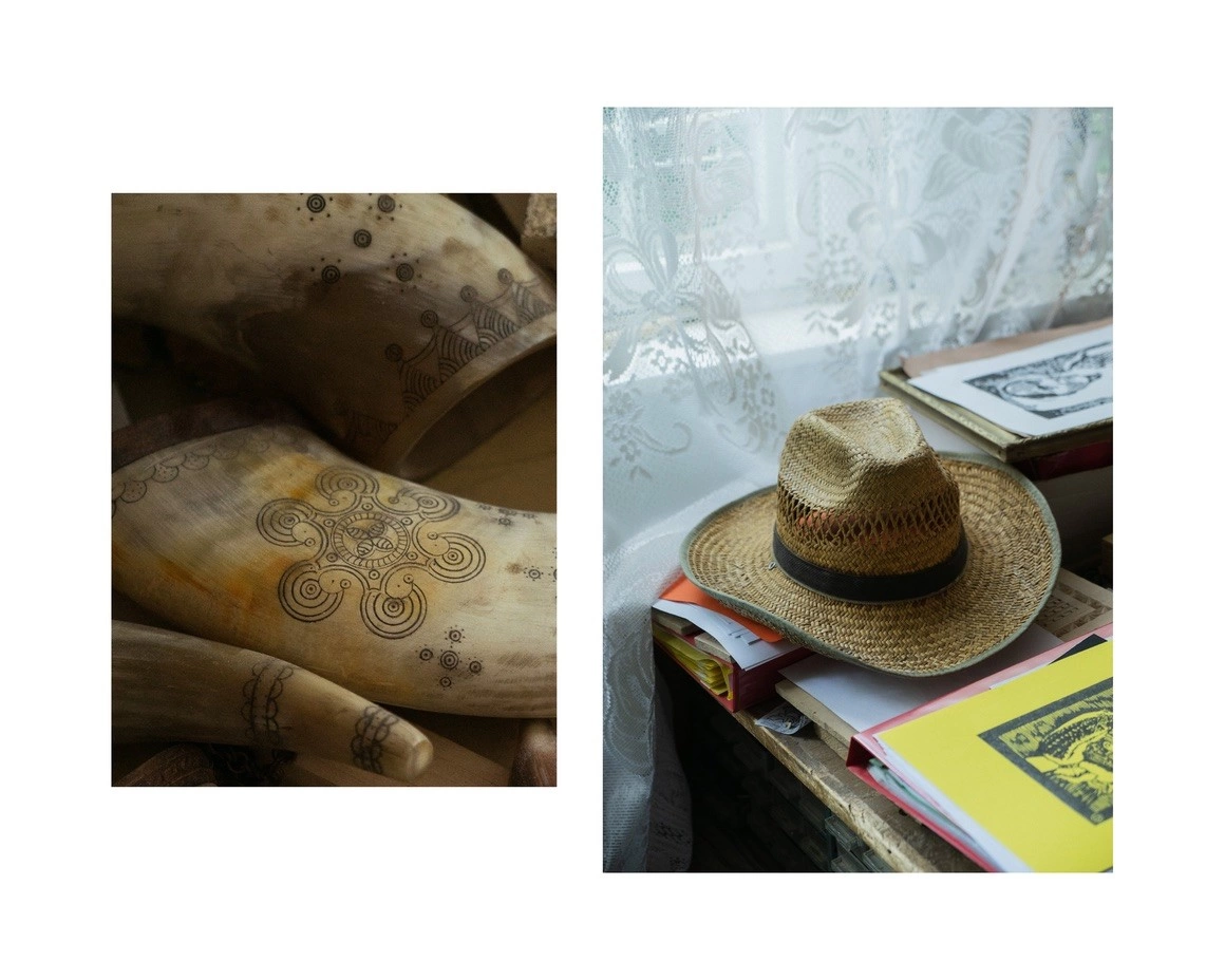 Ceva mai încolo stau cornurile vânătorești, din coarne de cerb, bivol și vită. Lac spune că nu mai era nimeni să-l învețe meșteșugul, așa că l-a redescoperit singur. Și-a făcut chiar el uneltele, dălțile, toate cele trebuincioase, „că n-am de unde să cumpăr - și nici cu ce. (Râde.)” Spune că e singurul din țară care s-a preocupat de multe astfel de meșteșuguri, așa că la el apelează muzeele, când au nevoie de demonstrații sau expoziții. „Și la summit la Sibiu ne-au chemat. Am fost cu zece copii. N-or prea venit ăia, președinții de state, în vizită, dar noi am fost.” Au făcut demonstrații, la muzeul în aer liber din Dumbrava Sibiului, de crestături în lemn, xilogravură, meșteșugit de jucării și câte altele.