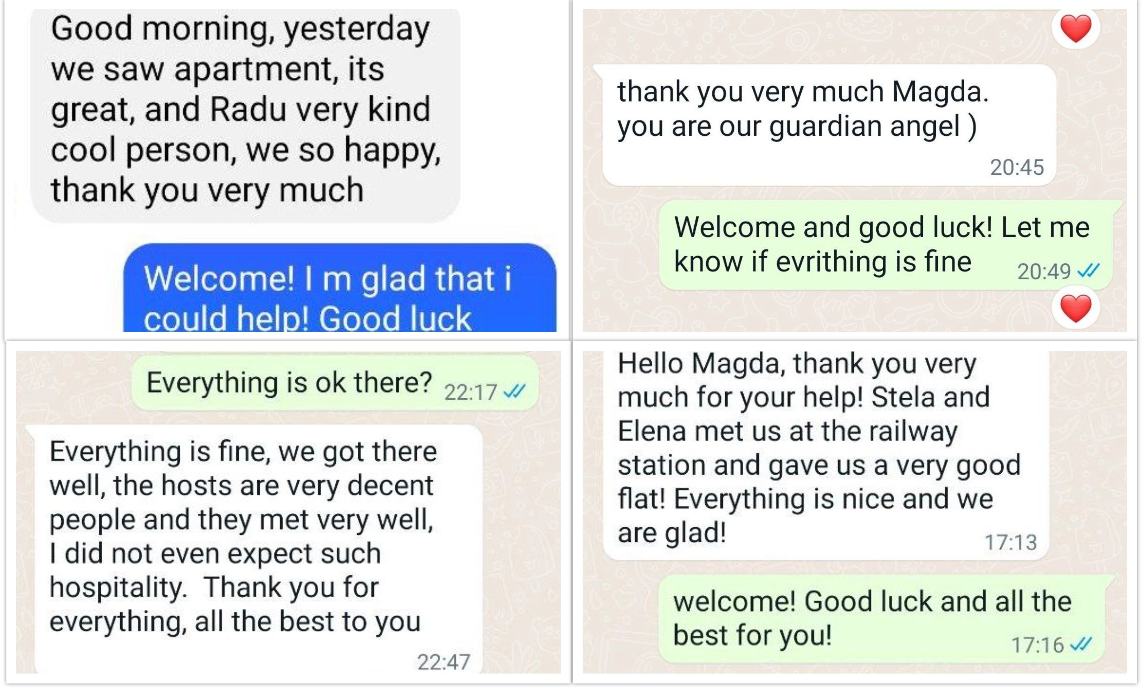 Magda Puiu (42 de ani) mi-a fost recomandată de Ira drept „mașinăria de găsit 50/20”. La începutul războiului, femeia lucra în logistică pentru o editură; între timp, s-a angajat la una dintre cele mai importante organizații europene pentru protecția copilului. Deși nu vorbește rusă sau ucraineană, a ajutat peste 100 de familii să găsească locuințe în România. Mai jos sunt câteva mesaje din corespondența ei cu refugiații pe care i-a sprijinit. Mediatoarea spune că, în general, a avut experiențe bune atât cu ucrainenii, cât și cu proprietarii români.