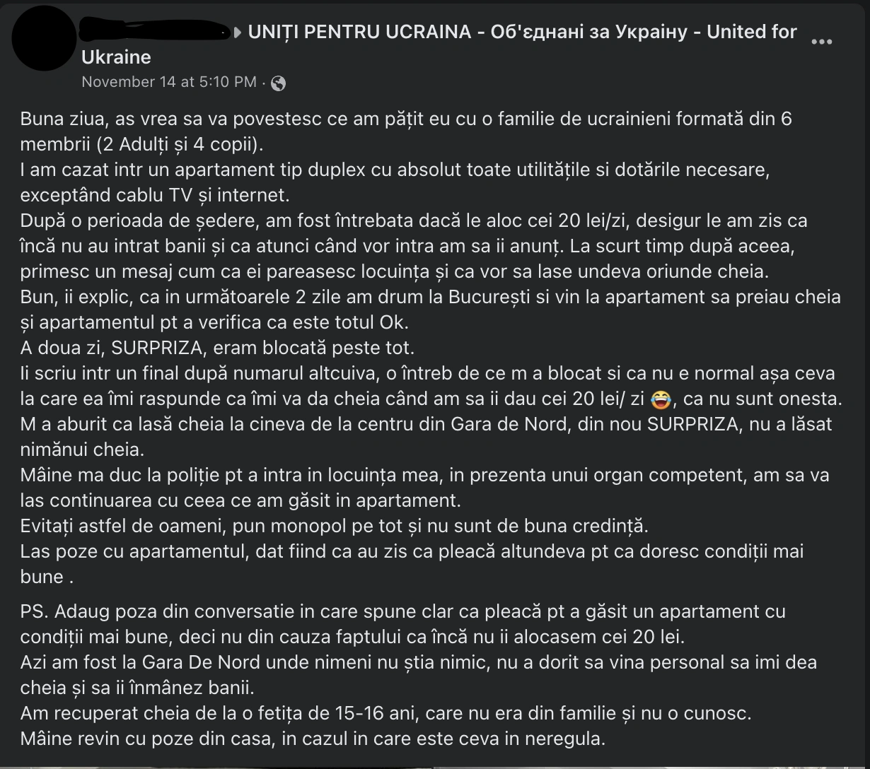 În contrapartidă, pe grupuri apar și cazuri în care proprietarii se plâng de cei cazați. Reclamă distrugeri sau plecări pe nepusă masă ale refugiaților, precum în situația de mai jos.