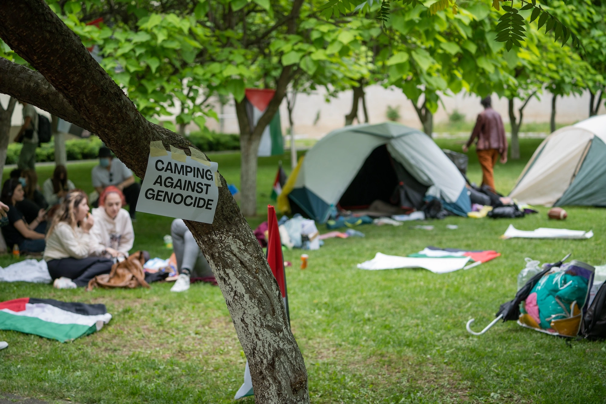 Mai mulți studențx de la Universitatea din București au protestat din 20 mai și până în 27 iunie pentru cauza palestiniană. Au campat în curtea Rectoratului, chiar lângă Facultatea de Sociologie și cea de Psihologie. Reprezentanții universității au chemat jandarmii de mai multe ori în încercarea de a-i face pe studențx să își ia corturile și să plece.