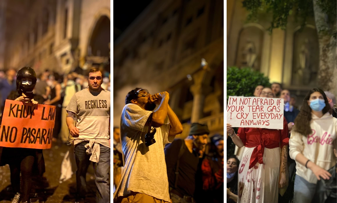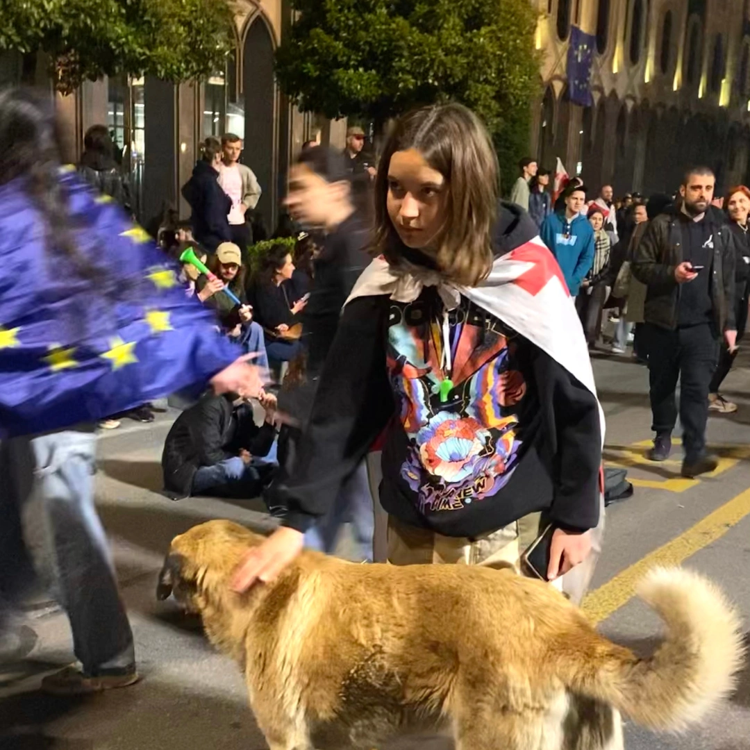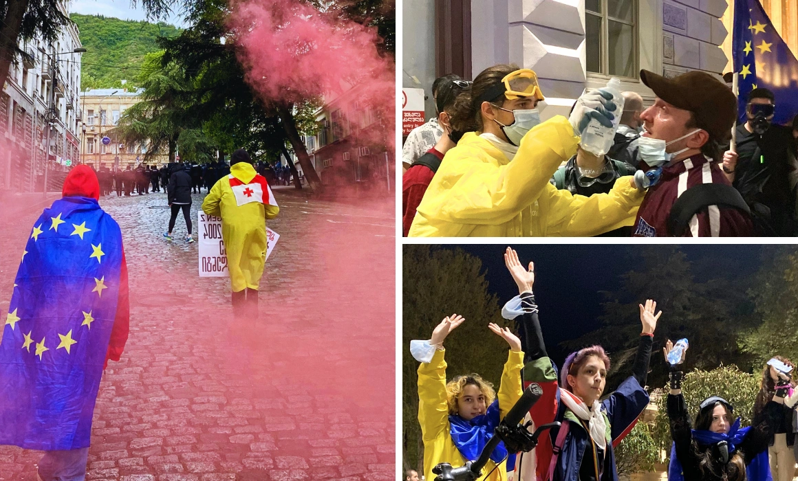 Cu cinci minute în urmă, toți acești tineri erau în fața Parlamentului Georgiei și în dreapta lui, pe strada 9 aprilie, numită astfel în memoria celor 21 de victime ale protestului anti-sovietic din 1989. unde tradițional sunt cordoanele de poliție. E prima săptămână de protest împotriva Legii privind „transparența influenței externe”, denumită inițial Legea „agenților străini”, și poliția a recurs din nou la gaze lacrimogene și tunuri de apă. Este deja a doua încercare a partidului Visul georgian de a introduce o lege foarte similară cu cea din Rusia, care prevede impunerea organizaţiilor care primesc mai mult de 20% din finanțare din străinătate să se înregistreze ca fiind agenţi de „influență externă”.