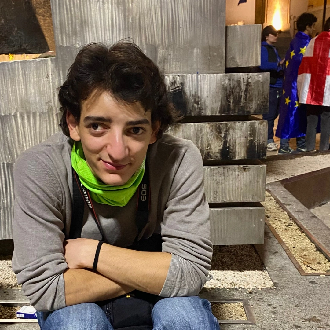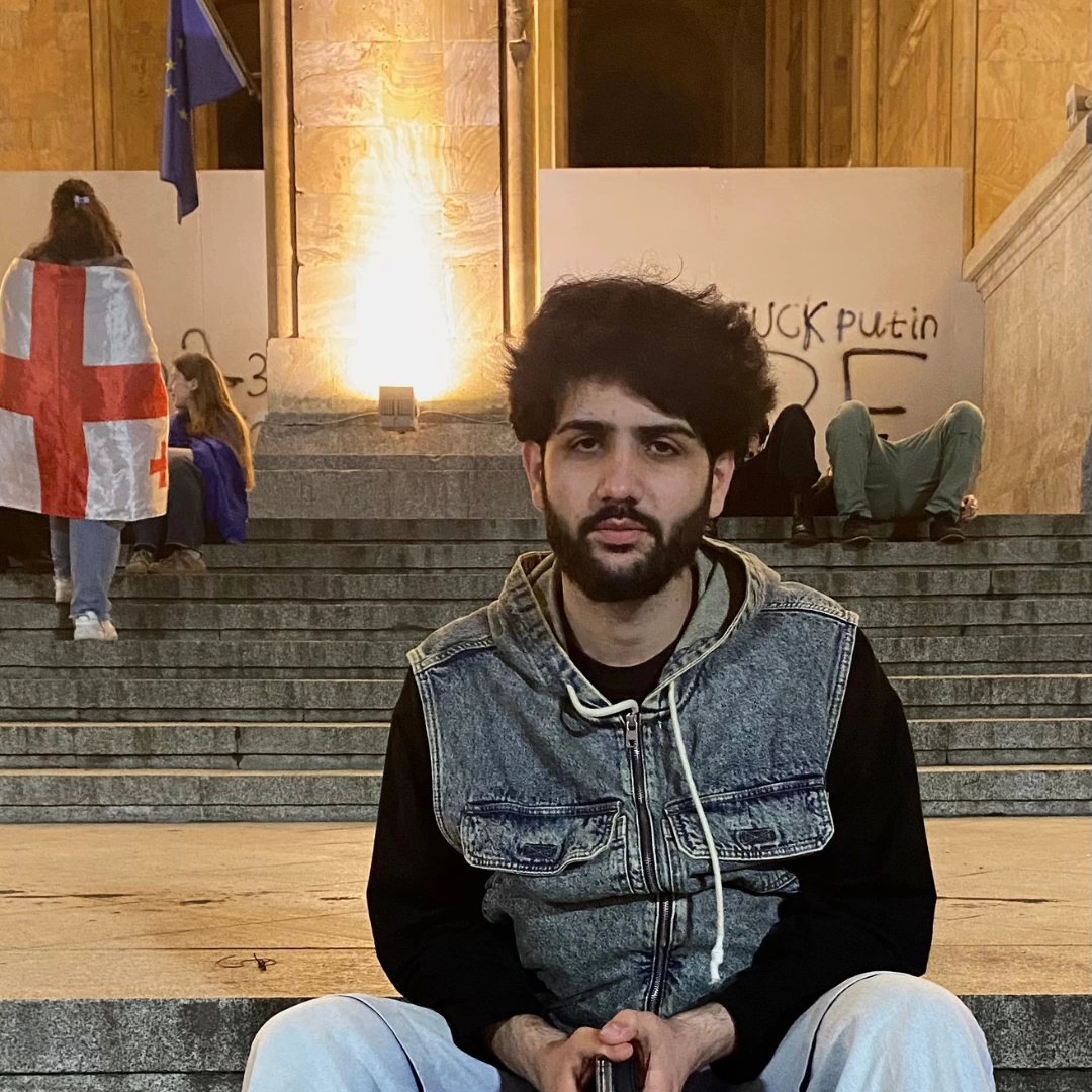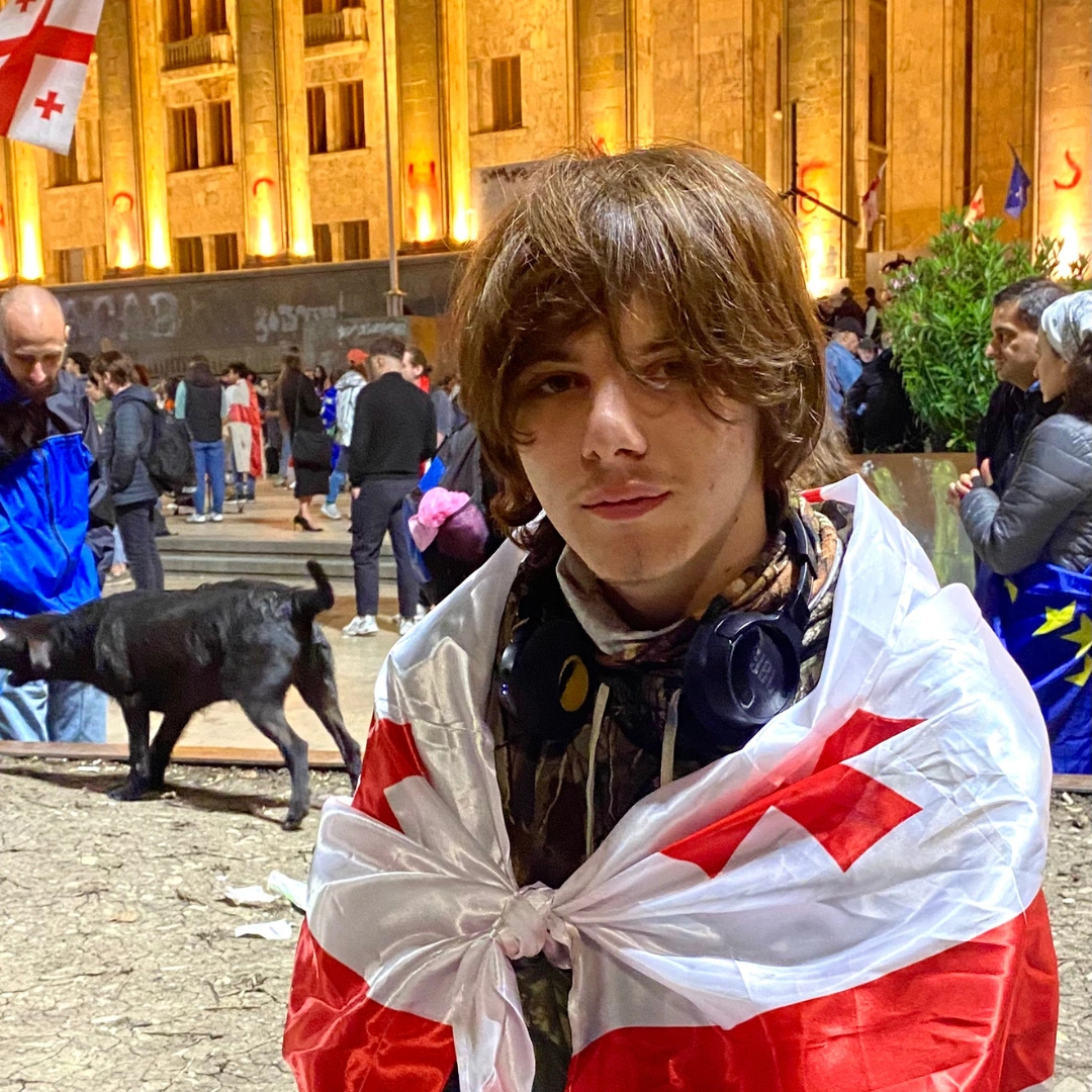 Sunt aici pentru că lupt pentru independența țării mele. Nu vreau ca țara mea să devină parte a Rusiei. Anul trecut, în martie, tot aici eram. Numim această lege lege rusească, deoarece este bazată pe narațiunea rusească și este în opoziție cu valorile UE. Țara noastră a trecut prin multe schimbări și nu e prima dată când se încearcă să ne apropie de Rusia. În 2019 a fost noaptea lui Gavrilov când guvernul nostru trăgea în noi din cauza unui ministru rus. Cred că doar tancurile ne pot opri să ieșim în stradă, așa cum s-a întâmplat pe 9 aprilie. Și tot, deși ne-am teme, oricum n-am ceda. Părinții mei sunt aici, dincolo de scările Parlamentului.