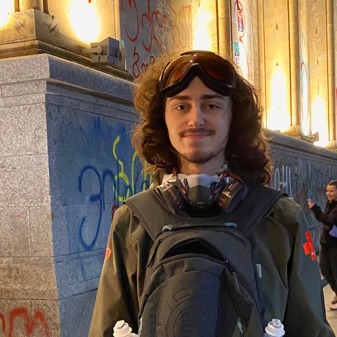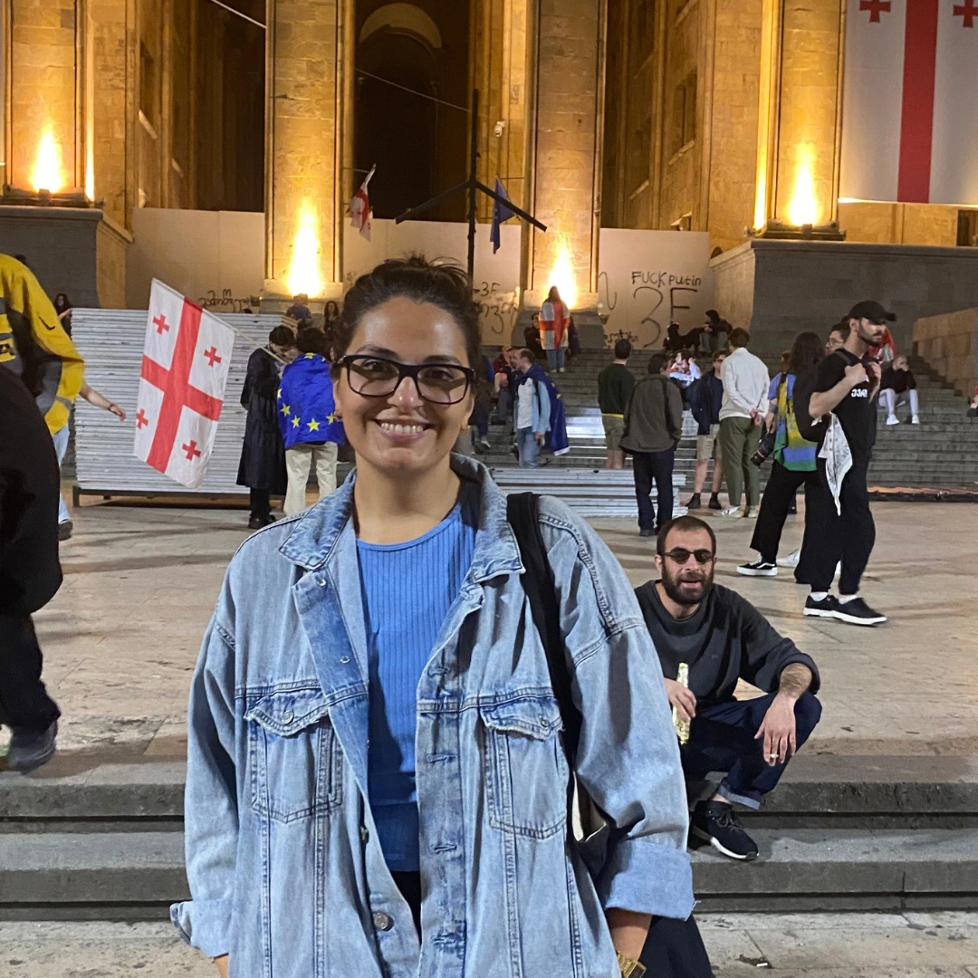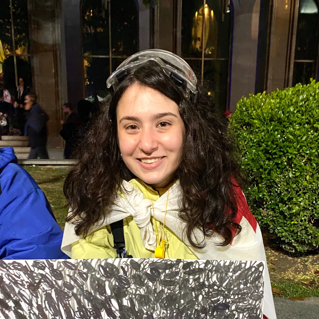 Sunt aici pentru că lupt pentru independența țării mele. Nu vreau ca țara mea să devină parte a Rusiei. Anul trecut, în martie, tot aici eram. Numim această lege lege rusească, deoarece este bazată pe narațiunea rusească și este în opoziție cu valorile UE. Țara noastră a trecut prin multe schimbări și nu e prima dată când se încearcă să ne apropie de Rusia. În 2019 a fost noaptea lui Gavrilov când guvernul nostru trăgea în noi din cauza unui ministru rus. Cred că doar tancurile ne pot opri să ieșim în stradă, așa cum s-a întâmplat pe 9 aprilie. Și tot, deși ne-am teme, oricum n-am ceda. Părinții mei sunt aici, dincolo de scările Parlamentului.