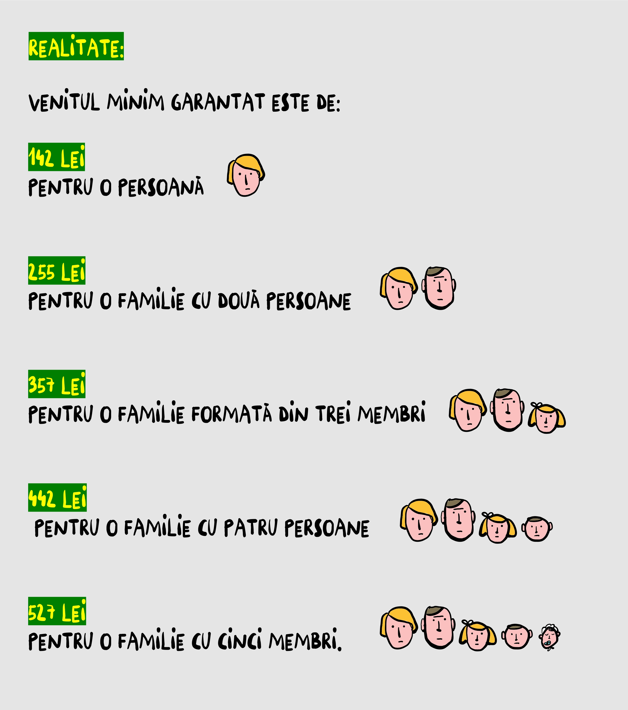 Venitul minim garantat este de 142 de lei pentru o persoană, 255 lei pentru o familie cu două persoane, 357 de lei pentru o familie formată din trei membri, 442 lei pentru o familie cu patru persoane și 527 lei pentru o familie cu cinci membri.