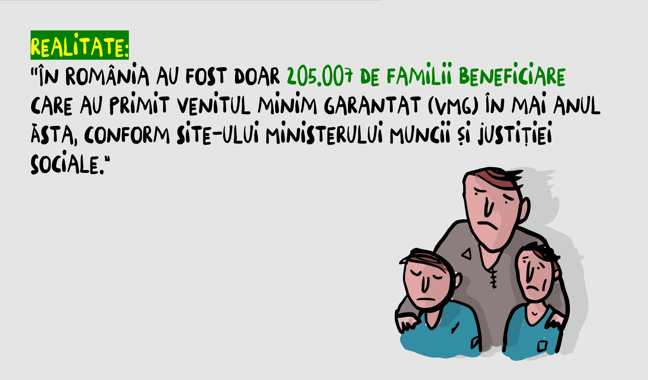 Este una dintre cifrele rostogolite de ani de zile în presă. Și o invenție totală. În România, erau în jur de 205.000 de familii beneficiare de VMG în mai anul acesta, conform datelor de la Ministerul Muncii și Justiției Sociale. De 34 de ori mai puțin decât apare în expunerea de motive.