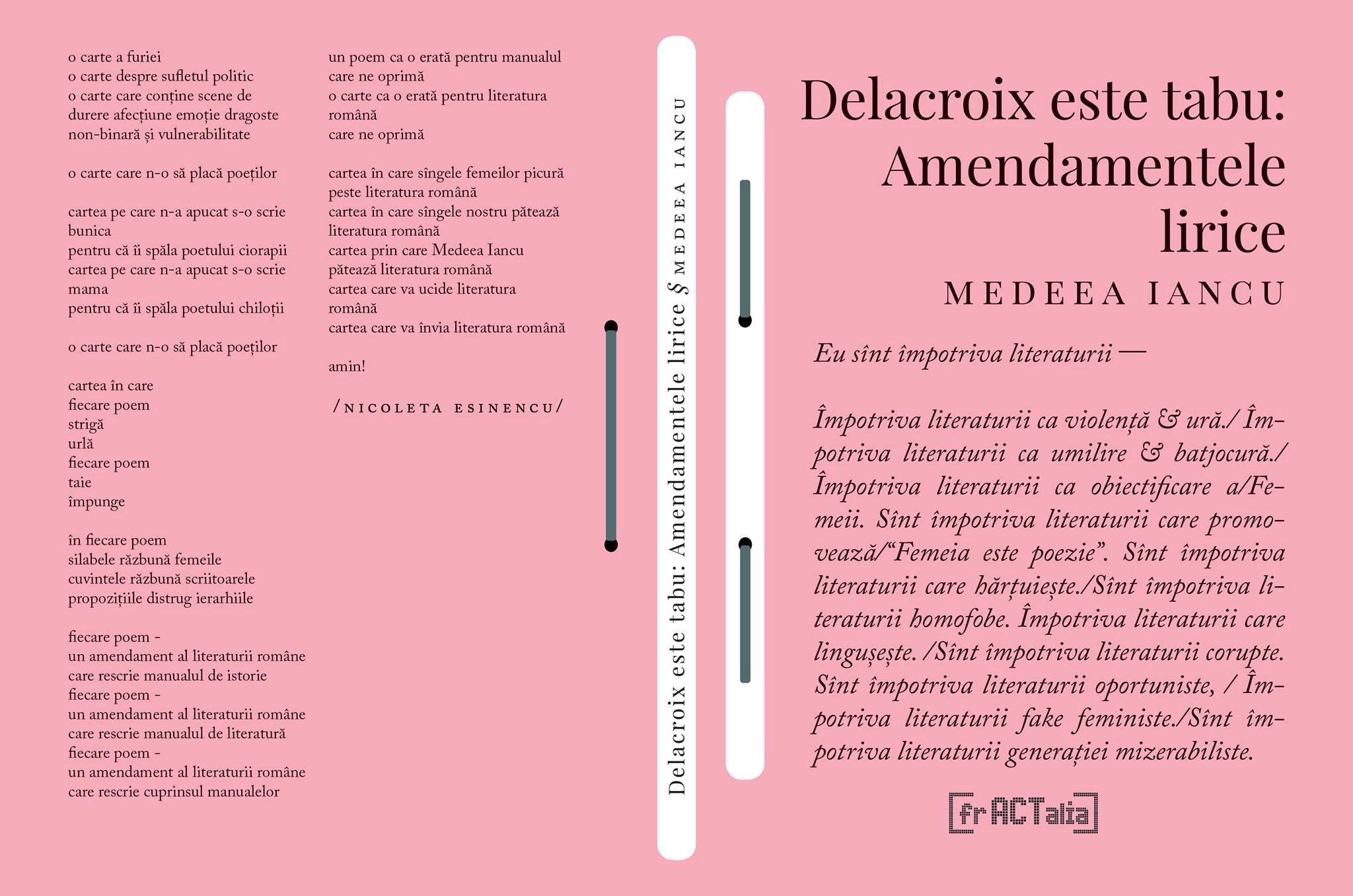 Medeea Iancu revine cu un nou volum în care poezia se împletește admirabil cu manifestul feminist: Delacroix este tabu. Amendamentele lirice (frACTalia). Tot Medeea Iancu îngrijește, la aceeași editură, o antologie de poezie feministă, Arta revendicării.