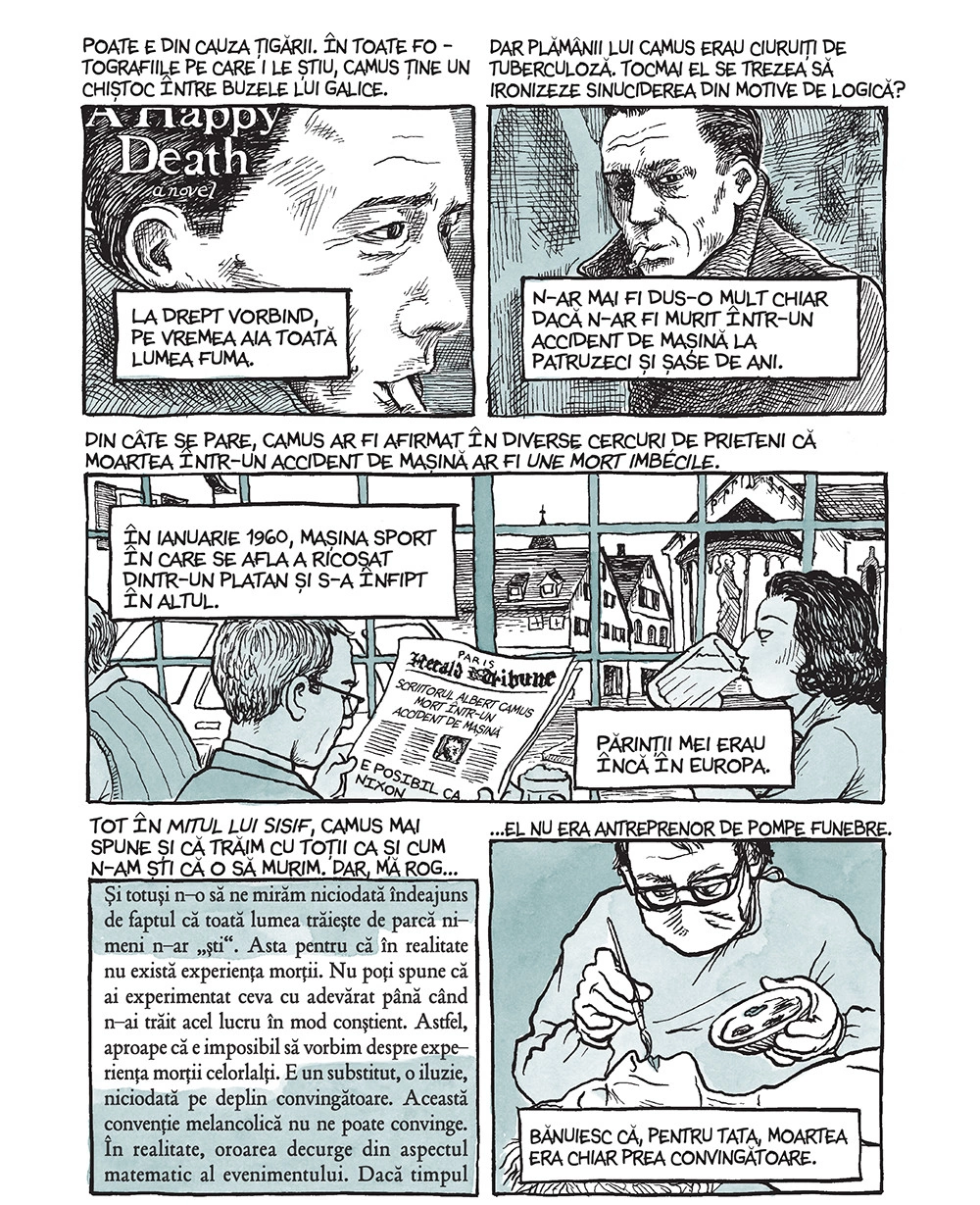 Casa veselă e una dintre cele mai emoționante și mai tandre cărți pe care le cunosc: m-a primit imediat în intimitatea ei și mi-a împrumutat din dispoziția de a scormoni lucid și înțelegător în debaraua propriei vieți. E prima autobiografie în benzi desenate și probabil cel mai dens roman grafic, din câte am citit. Autoarea, ilustratoarea americană Alison Bechdel, a lucrat la carte șapte ani, iar dăruirea asta se simte în cele mai mici detalii. În desenele extrem de sugestive, construite după fotografii, în felul cum sunt construite bulele de text - niște bijuterii miniaturale, care m-au recompensat pentru toate frustrările când bulele din atâtea benzi desenate mi se păreau simpliste . (E musai să menționez traducerea desăvârșită a Iuliei Gorzo.)