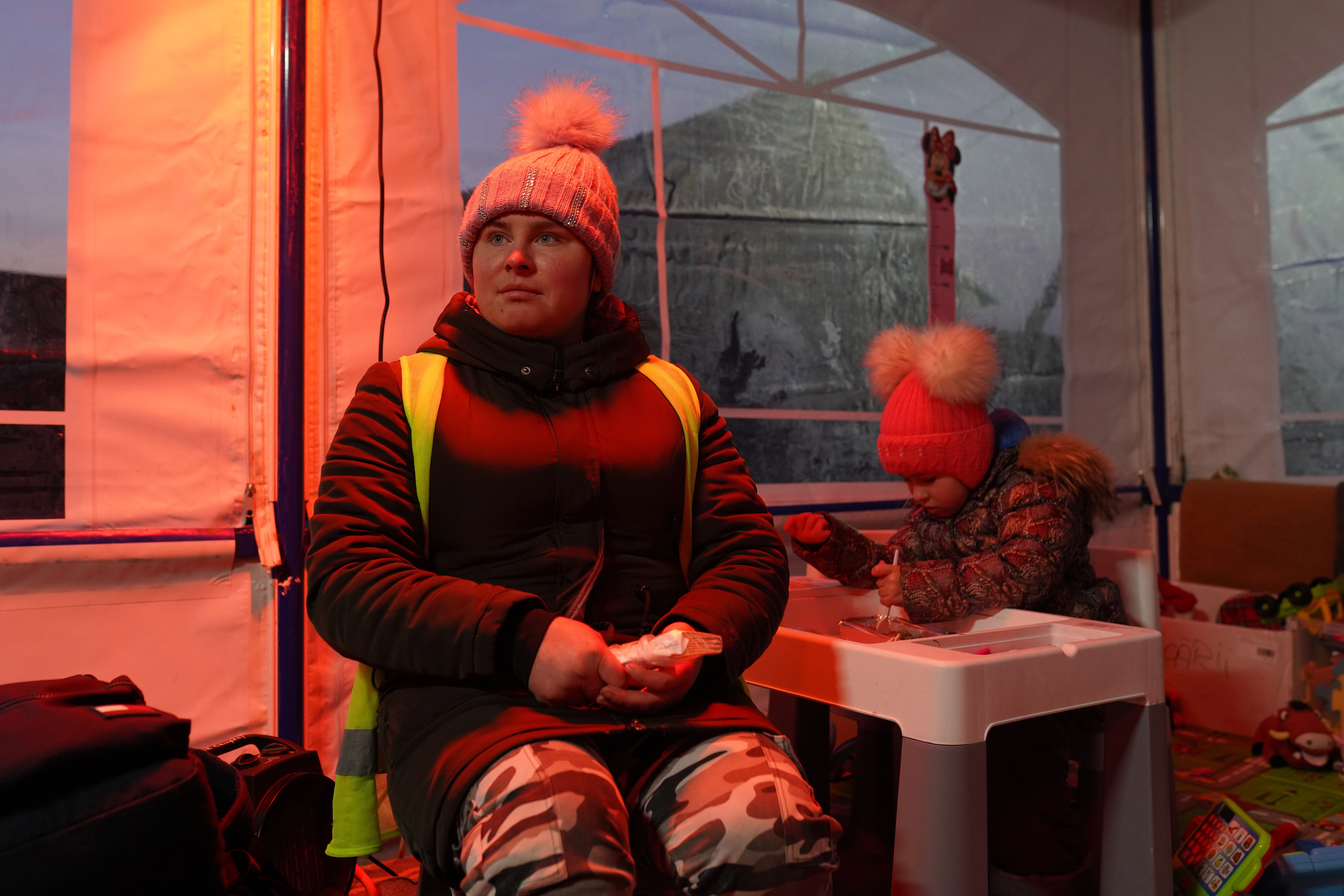 De la graniță, mai mulți voluntari și polițiști îi conduc pe oameni spre un microbuz galben pe care scrie „Transport elevi” și îi ajută cu bagajele. Microbuzul îi duce la Punctul de Informare aflat la câteva minute distanță, unde alți voluntari împart într-un cort ceai, cafea, pâine cu salam, turtă dulce, covrigei, mere, biscuiți, iaurturi, vorbe bune și informații despre transport. Mai multe autobuze oferă curse gratuite sau contra cost către Chișinău, România, Polonia sau Cehia. Într-un cort de lângă, două radiatoare încearcă să facă față fără prea mare succes. Afară sunt câteva grade sub zero și înăuntru se ghemuiesc pe bănci de lemn copii, tineri și mame, unii cu pături pe ei. În capătul cortului e un spațiu de joacă unde copiii și adulții se descalță când intră.