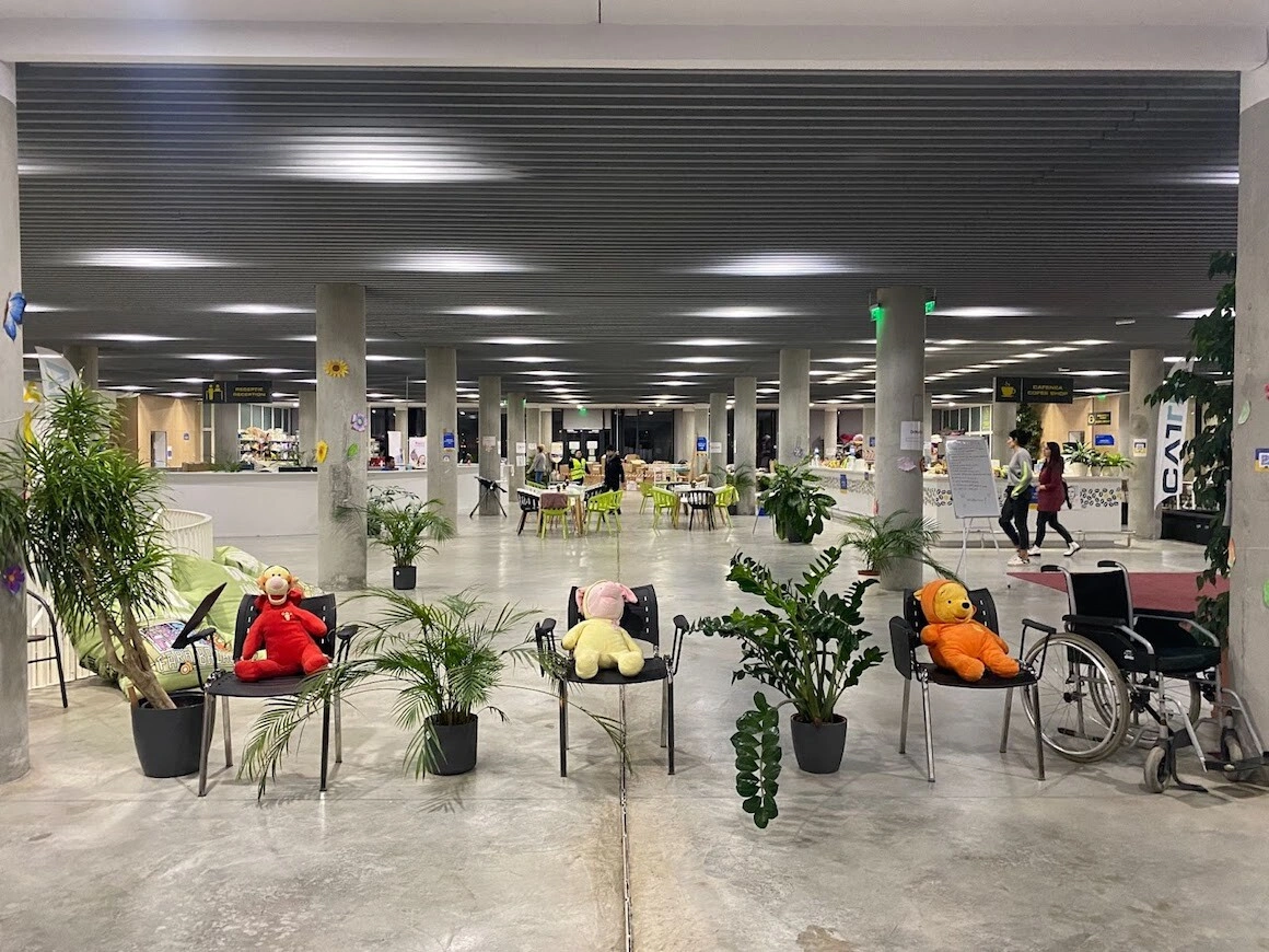 Elina le explică ușor rușinată contextul demersului. Zilnic, în spațiu, sunt mai mulți copii decât adulți. Copiii au mare nevoie de activități structurate, în limba ucraineană, ca să-i țină ocupați și feriți de știri despre bombardamente. La locul de joacă amenajat în spațiu sunt mereu prezenți voluntari români care încearcă să-i distreze și să-i implice în jocuri. Chiar și cei mai extrovertiți se retrag după câteva minute, pentru că le e greu să comunice. Cei mici fug după mamele lor, cei mari se adâncesc în telefoane. Sunt copii care preferă să se joace singuri cu un pluș sau să coloreze. Alții dau ture cu bicicleta prin spațiu, spre disperarea adulților. Mai sunt și cei care se joacă de-a războiul, între tranșee construite din bean bags, cu căști de pompieri pe cap și pistoale de jucărie în brațe.