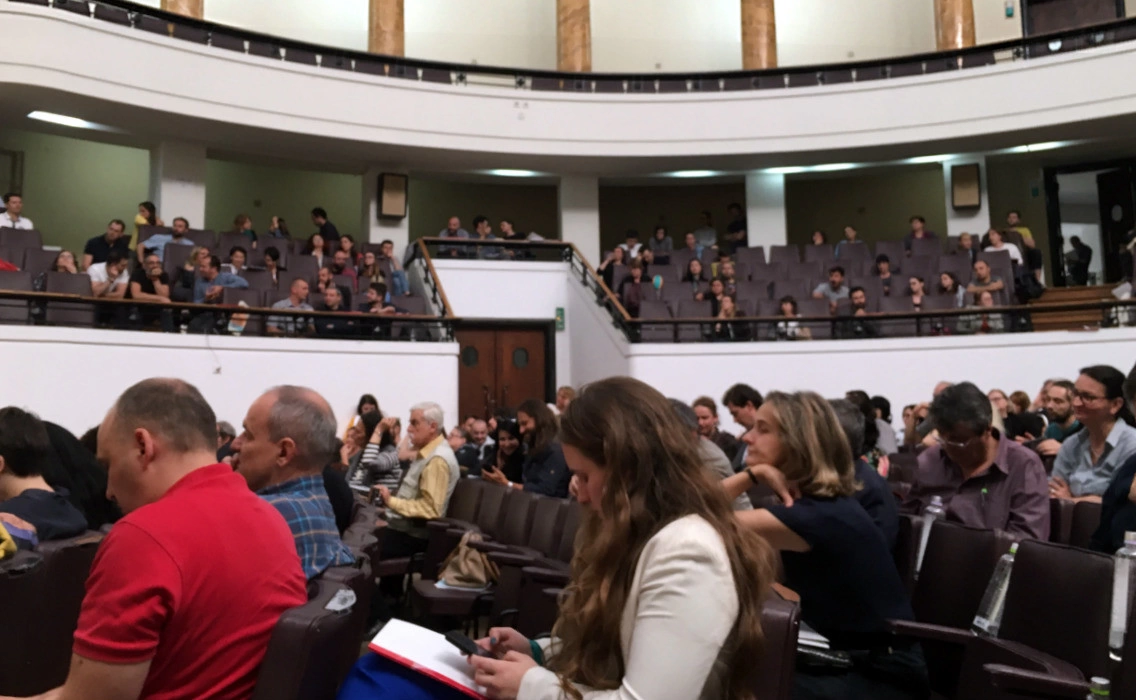 La ora 14, în Aula Magna se face prezența delegaților și e aplaudat fiecare în parte. Momentul se transformă într-un concurs spontan de popularitate: unii delegați sunt aplaudați vizibil mai intens. Printre ei, și președintele în funcție, Șerban Sturdza, sau Ana-Maria Zahariade, profesoară de Istoria și Teoria Arhitecturii la Universitatea de Arhitectură și Urbanism „Ion Mincu” (UAUIM). Urmează o tentativă de explicare a procedurii complicate de vot, care, însă, se soldează cu vociferări, întrebări ironice din public și rumoare.
