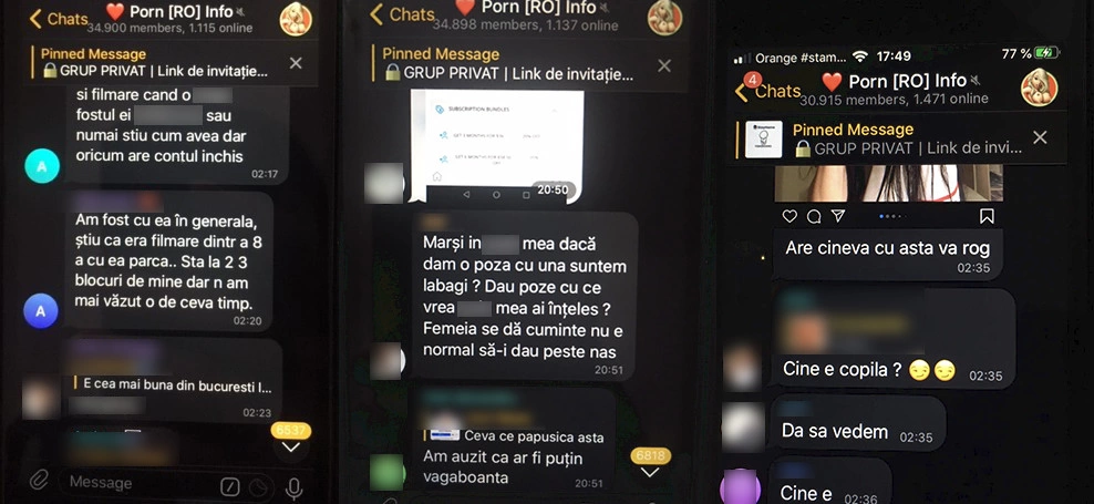 „Cu pisicuța asta avem ceva?” întreabă un utilizator anonim și dă o captură de ecran cu numele și profilul unei fete de pe Instagram. În fiecare minut, apar câteva zeci de mesaje ca ăsta, de la cei peste o mie de membri care sunt online zilnic, la orice oră. Dacă le cunosc pe fetele minore sau pe femeile adulte, băieții răspund cu fotografii cu corpurile lor goale sau cu filmări pornografice în care apar acestea. Despre unele spun că fac videochat sau că sunt prostituate, despre altele că sunt vecinele, colegele sau fostele lor iubite.