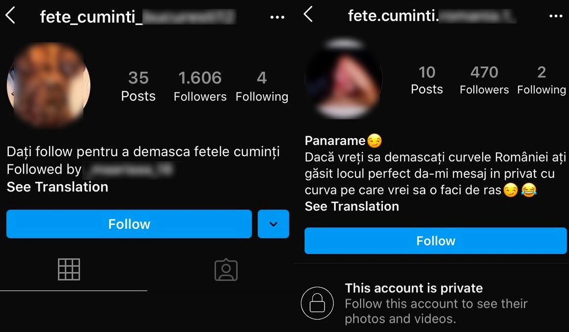 Oricine poate intra pe aceste conturi, unde utilizatorii sunt îndemnați să aprecieze pozele și să participe la mici jocuri, în urma cărora vor fi postate imagini noi. „Dacă vreți să demascați curvele României ați găsit locul perfect. Dă-mi mesaj în privat cu curva pe care vrei s-o faci de râs”, anunță descrierea unuia dintre conturi. „Vreau promovaree. La 100 de urmăritori o să pun un video ca lumea”, promite într-un story administratorul anonim al unui alt cont. Alții îi invită pe privitori să participe la un joc de șantaj pornografic: „Am primit un video cu B. când își dă drumu’ unu’ în gura ei, îl vreți?” Utilizatorii sunt îndemnați să dea like și, dacă vor să vadă imagini și mai hot, să distribuie pozele în story-urile proprii. Când un cont din seria „fete cuminți” dispare, după ce mai multe persoane semnalează celor de la Instagram că imaginile încalcă regulile rețelei, altul îi ia locul, iar unele dintre postările vechi reapar alături de conținut nou. Alteori, conturile devin private, pentru a întârzia ștergerea.