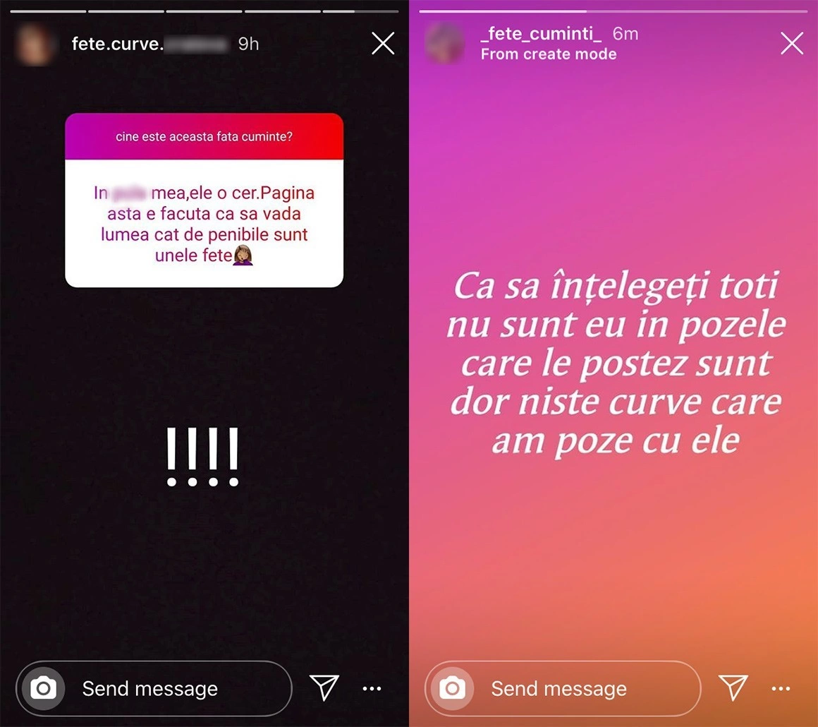 Te-am văzut goală la story pe pagina asta, i-a scris un tip unei adolescente a cărei poză nud o găsise pe unul dintre conturile „fete cuminți”. Nicoleta are 16 ani, locuiește într-o comună și nici ea nu e la prima experiență cu revenge porn. Prima oară s-a întâmplat acum doi ani. A doua oară a fost la jumătatea lunii trecute, când prietena ei cea mai bună, care îi știa parolele, a luat din telefonul fetei câteva poze cu ea dezbrăcată, apoi le-a dat mai departe. „Nu mă ascund, nu credeam că o să-mi facă ceva vreodată”, îmi explică Nicoleta. Imaginile au ajuns pe un chat privat de pe aplicația Telegram și în story-urile mai multor conturi „fete cuminți” de pe Instagram. Și prietena ei le-a postat pe contul ei de Insta, cu etichetă la profilul personal al Nicoletei și mesaje agresive de hărțuire.