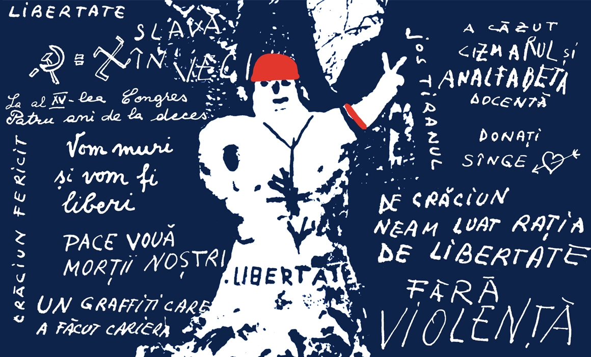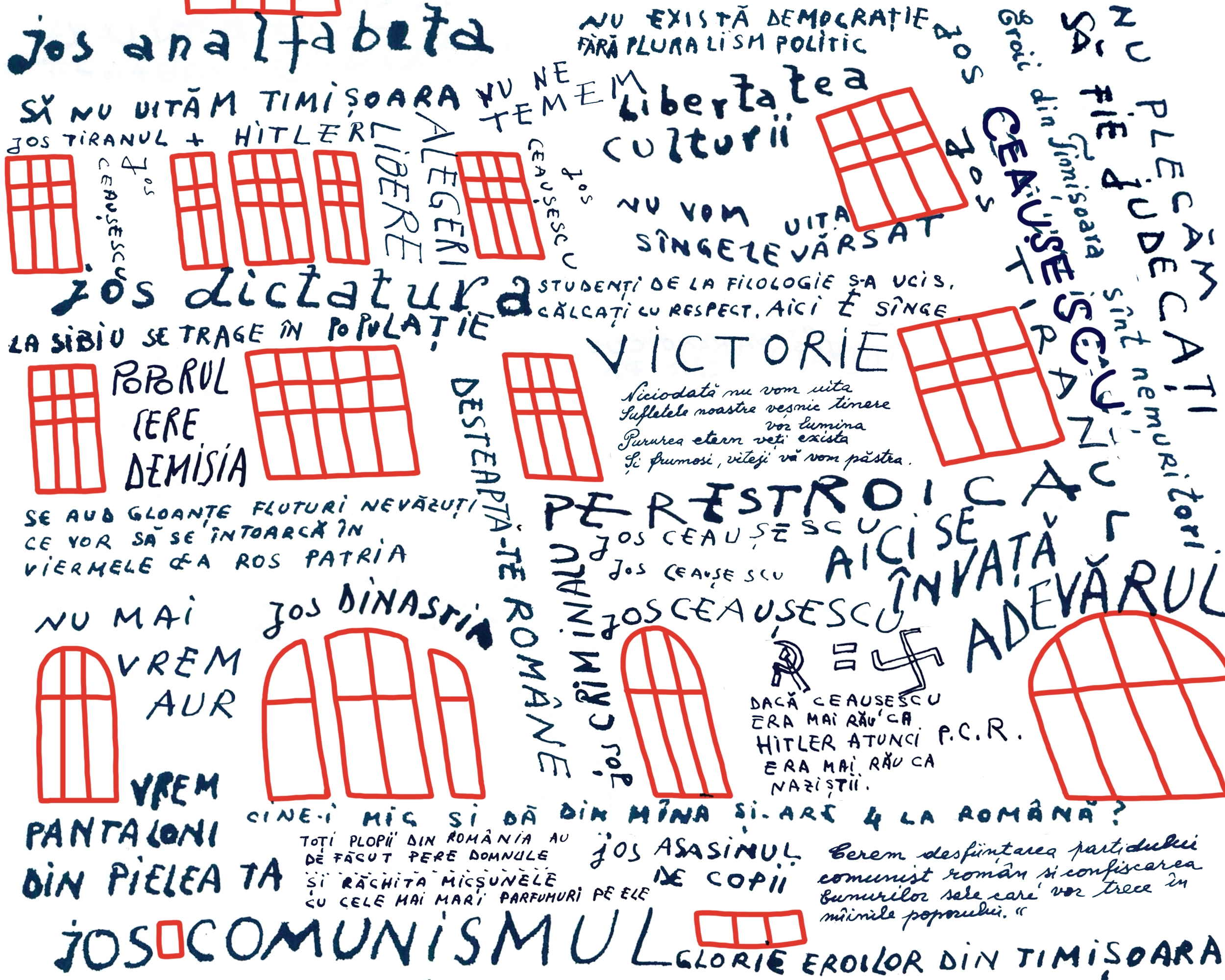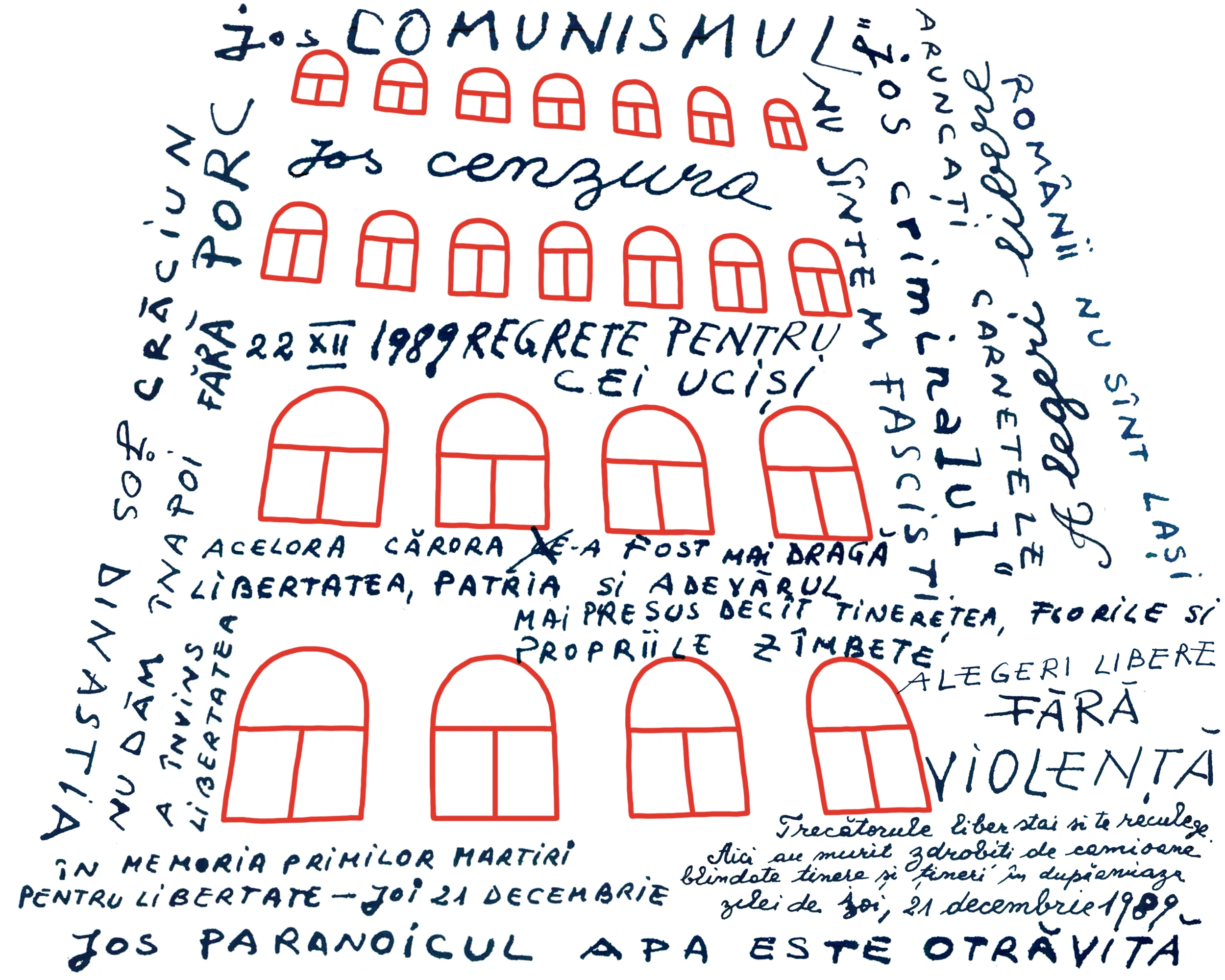 Inscripțiile de pe zidurile Revoluției, transcrise de etnologul Irina Nicolau și publicate acum 19 ani sub forma unei broșuri, au un efect la fel de puternic asupra mea. Le-am regăsit întâmplător acum câteva zile, în timpul unei vizite la Arhiva de Imagine a Muzeului Național al Țăranului Român. E o colecție de graffiti - 141 de texte cu totul - culese imediat după acele zile din zona Pieței Universității: soclul statuii lui Spiru Haret, fațada Universității București și a Facultății de Arhitectură, pereții Hotelului Intercontinental, blocurile Dunărea și Pescarul, intrarea în blocul Dalles și pomul împodobit cu lozinci din fața clădirii, bulevardul Magheru și un soclu dispărut între timp din Piața Romană.