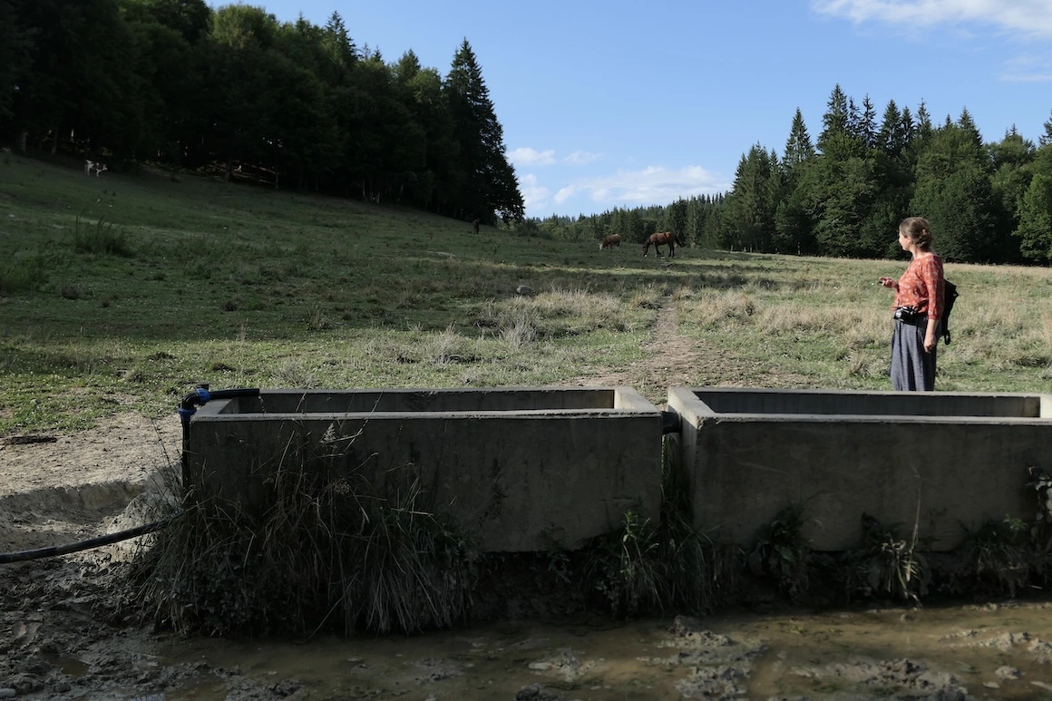 Emanuela și Orsolya au făcut toate astea în cadrul rezidenței Flowing Streams: au mers să vadă vacile, au vorbit cu localnicii și au căutat izvoarele în pădure. Brădet se află în zona cunoscută ca Întorsura Buzăului, nume care vine de la faptul că aici cursul râului Buzău „se întoarce”, făcând o curbă. „Pentru mine să parcurg distanțele pe jos și să văd peisajul ca o experiență a fost foarte important”, spune Orsolya.