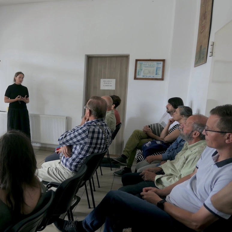 Oamenii din sală ascultă și din când în când intervin cu completări. E o atmosferă caldă de duminică înceată, în care nimeni nu se grăbește nicăieri. Cei mai mulți sunt oameni din zonă, pe care Orsolya i-a întâlnit în timpul plimbărilor și de la care a aflat multe dintre informațiile care stau la baza lucrării ei. Un localnic a adus și fotografii cu râul de-a lungul timpului, care circulă din mână-n mână și stârnesc alte discuții. Pe o masă din colț sunt borcane cu apă din diferite izvoare văzute de Orsolya, iar pe alta platouri de mâncare și o prăjitură făcută de cineva din sat. Afară plouă cu picuri mari.
