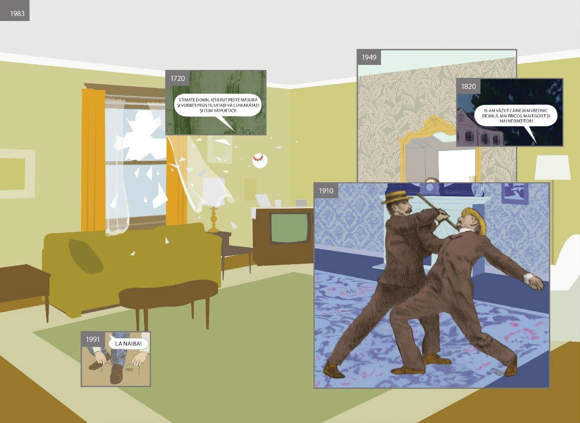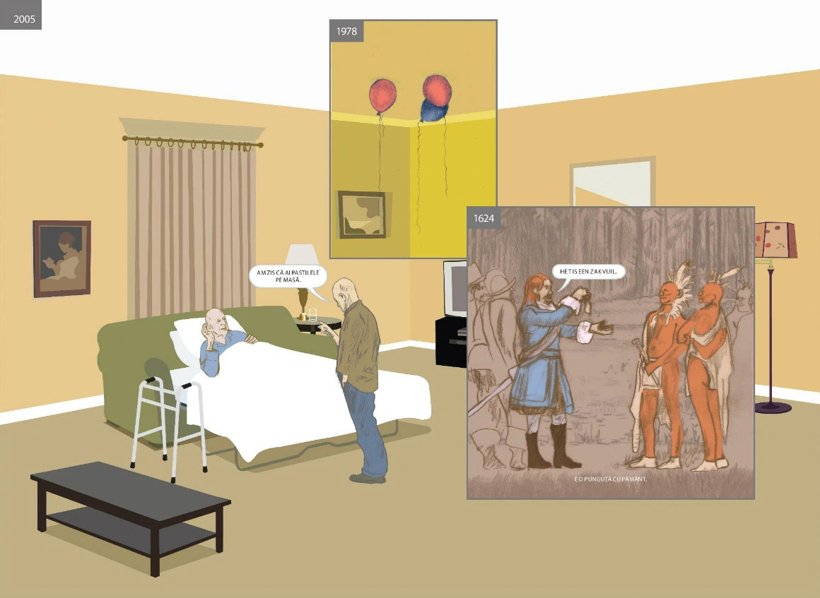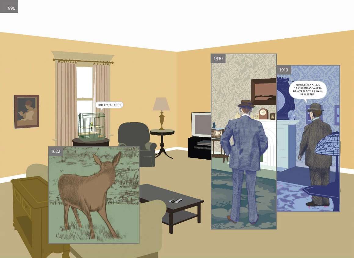 Nu e nevoie s-ajungi la vreun sit istoric, ca să pici într-o reverie despre straturile de istorie care încap într-un loc. E de-ajuns să pornești de acasă sau de Aici - o carte ale cărei coperți deschid un portal. Aici, de altfel, e considerat roman grafic doar pentru că ar fi prea complicat să găsești un nume potrivit pentru ce face Richard McGuire în paginile lui: un soi de exercițiu poetic pe marginea istoriei, asupra căreia nu se mai satură să dea zoom in - zoom out, un performance al imaginației. Concret, McGuire (ilustrator, designer grafic, designer de jucării, muzician) călătorește în uriașa debara a lumii fără să se miște dintr-un punct. Ia o cameră și-o întoarce pe toate părțile, o așează în atâtea și-atâtea lumi posibile, și-o imaginează în trecuturi și viitoruri. Vezi, chiar aici pe canapeaua unde stai cu fața luminată de laptop, păștea în urmă cu vreo zece milenii un bizon. Tot acolo și-au făcut singura poză de familie niște oameni de care nici nu știi c-au existat, înainte să izbucnească războiul. Chiar Aici, peste vreo 220 de ani va trece un pod și nimeni nu va mai știi că aici ai dormit și-ai visat timp de aproape o viață.