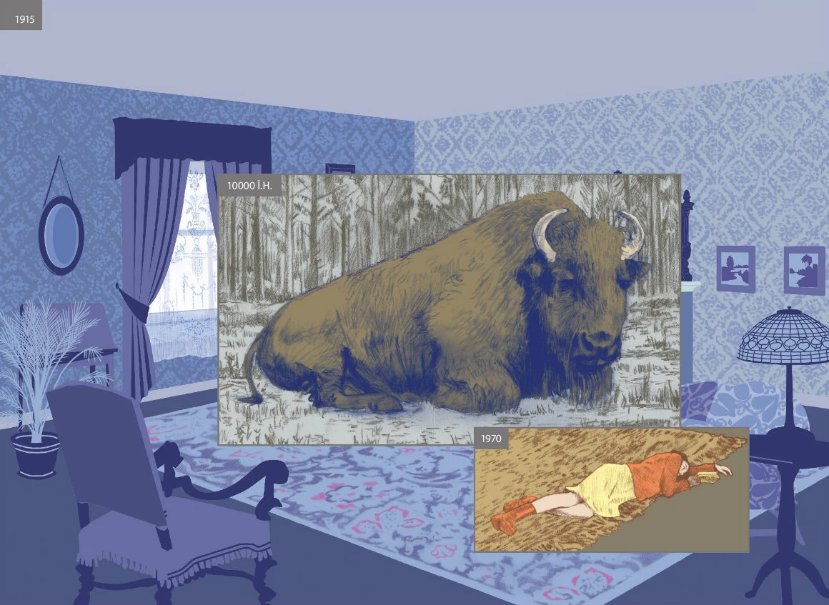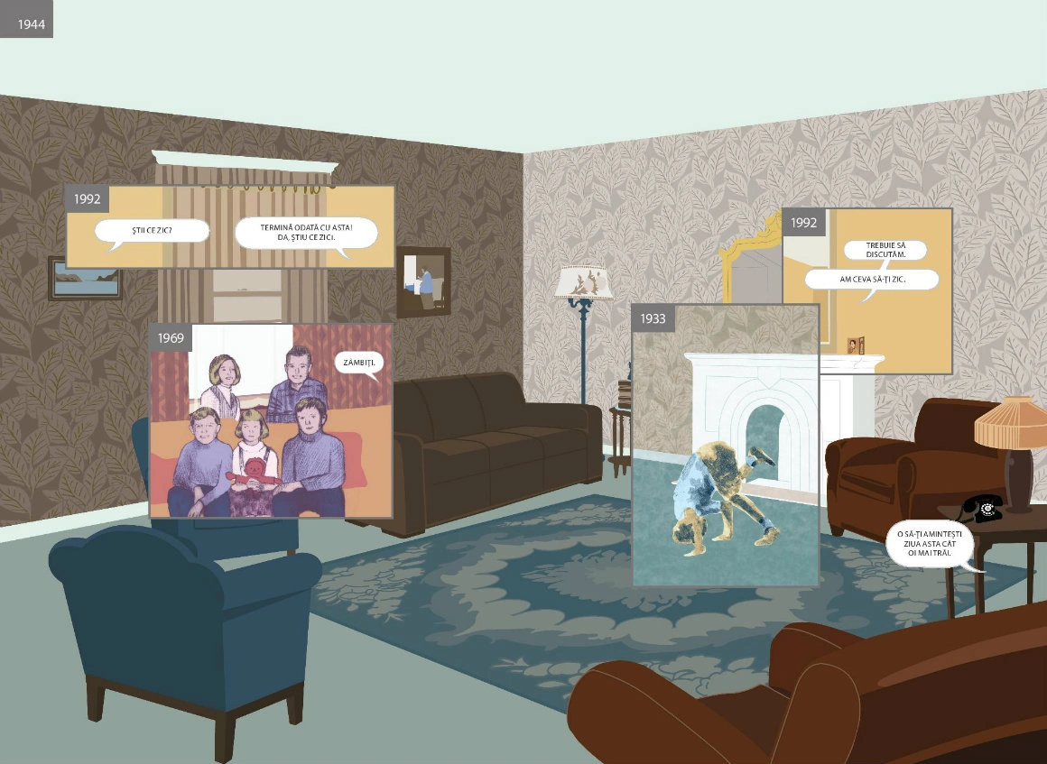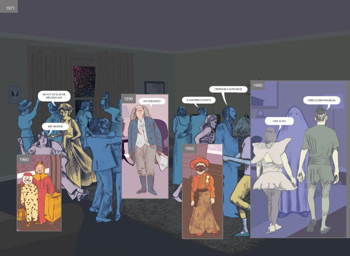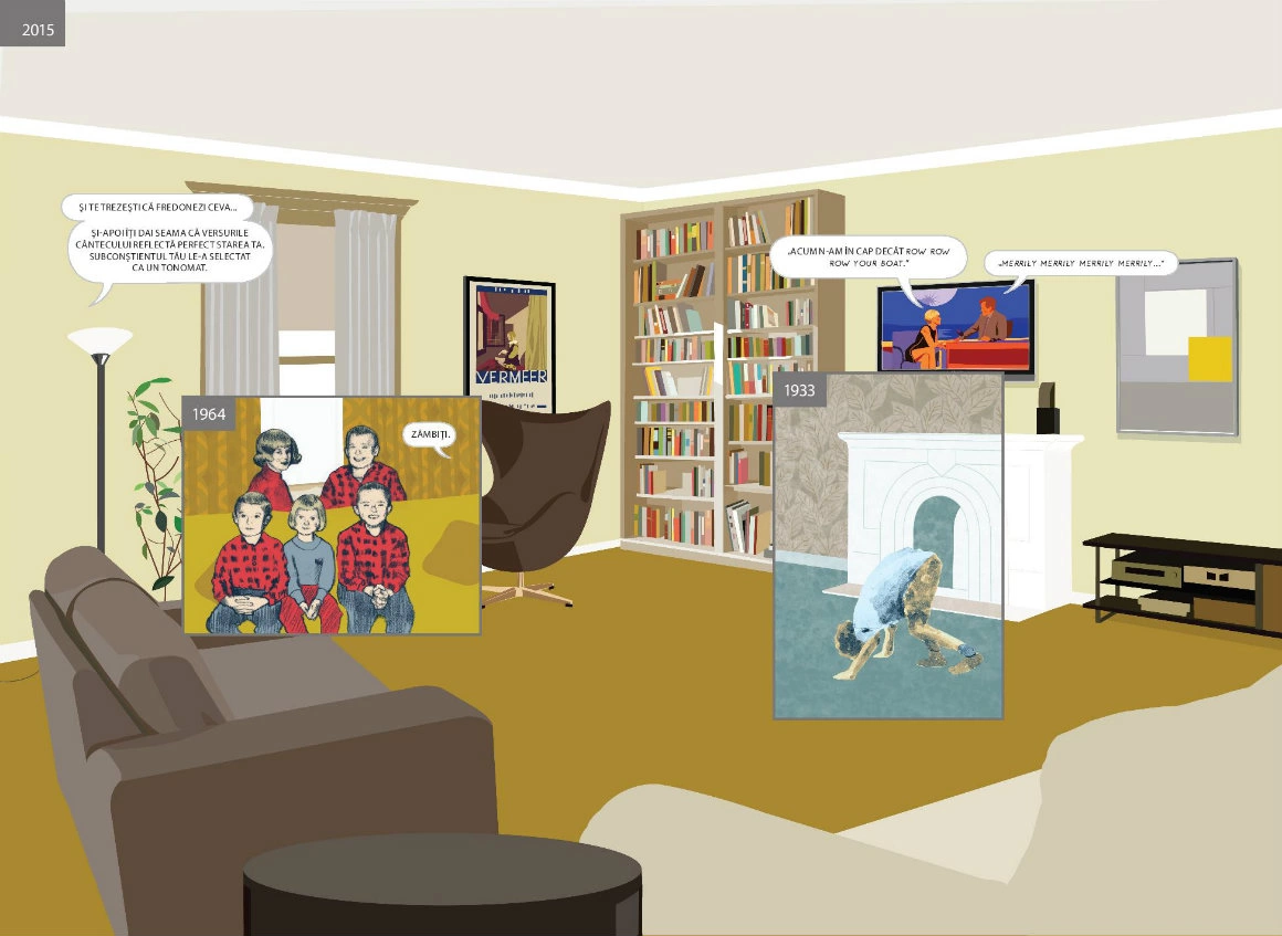 Nu e nevoie s-ajungi la vreun sit istoric, ca să pici într-o reverie despre straturile de istorie care încap într-un loc. E de-ajuns să pornești de acasă sau de Aici - o carte ale cărei coperți deschid un portal. Aici, de altfel, e considerat roman grafic doar pentru că ar fi prea complicat să găsești un nume potrivit pentru ce face Richard McGuire în paginile lui: un soi de exercițiu poetic pe marginea istoriei, asupra căreia nu se mai satură să dea zoom in - zoom out, un performance al imaginației. Concret, McGuire (ilustrator, designer grafic, designer de jucării, muzician) călătorește în uriașa debara a lumii fără să se miște dintr-un punct. Ia o cameră și-o întoarce pe toate părțile, o așează în atâtea și-atâtea lumi posibile, și-o imaginează în trecuturi și viitoruri. Vezi, chiar aici pe canapeaua unde stai cu fața luminată de laptop, păștea în urmă cu vreo zece milenii un bizon. Tot acolo și-au făcut singura poză de familie niște oameni de care nici nu știi c-au existat, înainte să izbucnească războiul. Chiar Aici, peste vreo 220 de ani va trece un pod și nimeni nu va mai știi că aici ai dormit și-ai visat timp de aproape o viață.